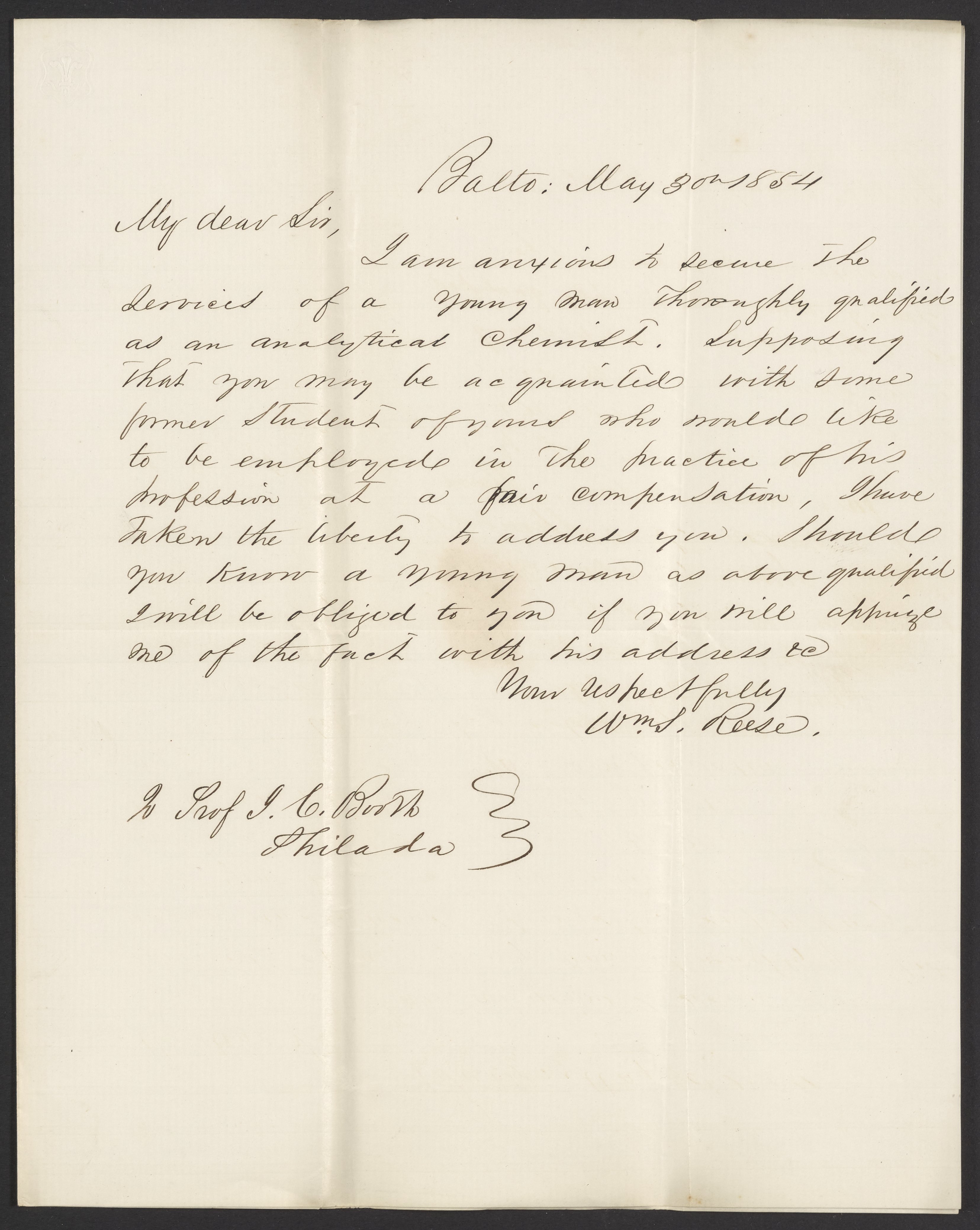 Letter from W.S. Reese to James Curtis Booth, May 30, 1854