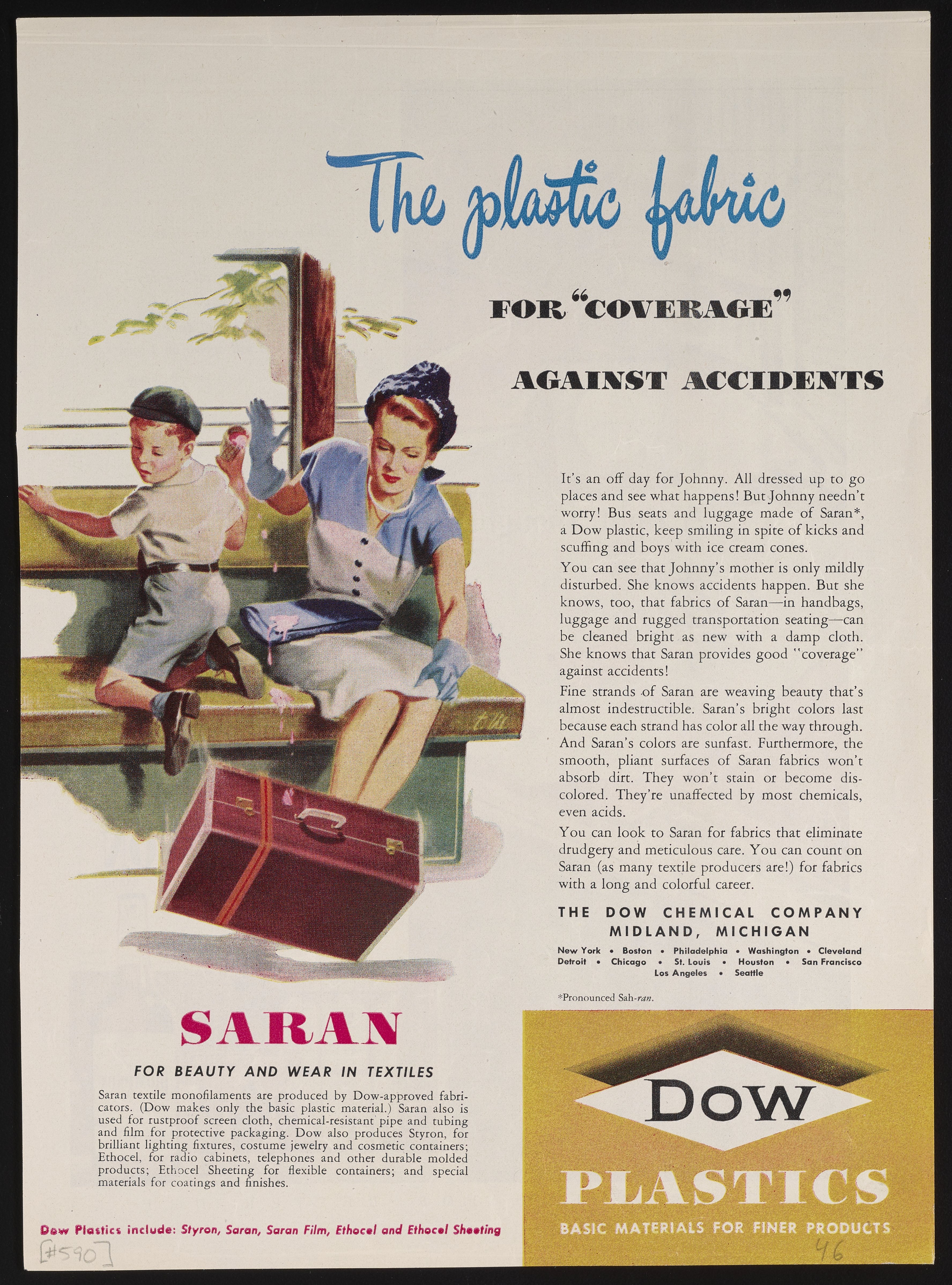 Dow Chemical Company. “The Plastic Fabric for ‘Coverage’ Against Accidents,” circa 1946. Advertisements from the Dow Chemical Historical Collection, Box 9. Science History Institute. Philadelphia. https://digital.sciencehistory.org/works/dhe5803.