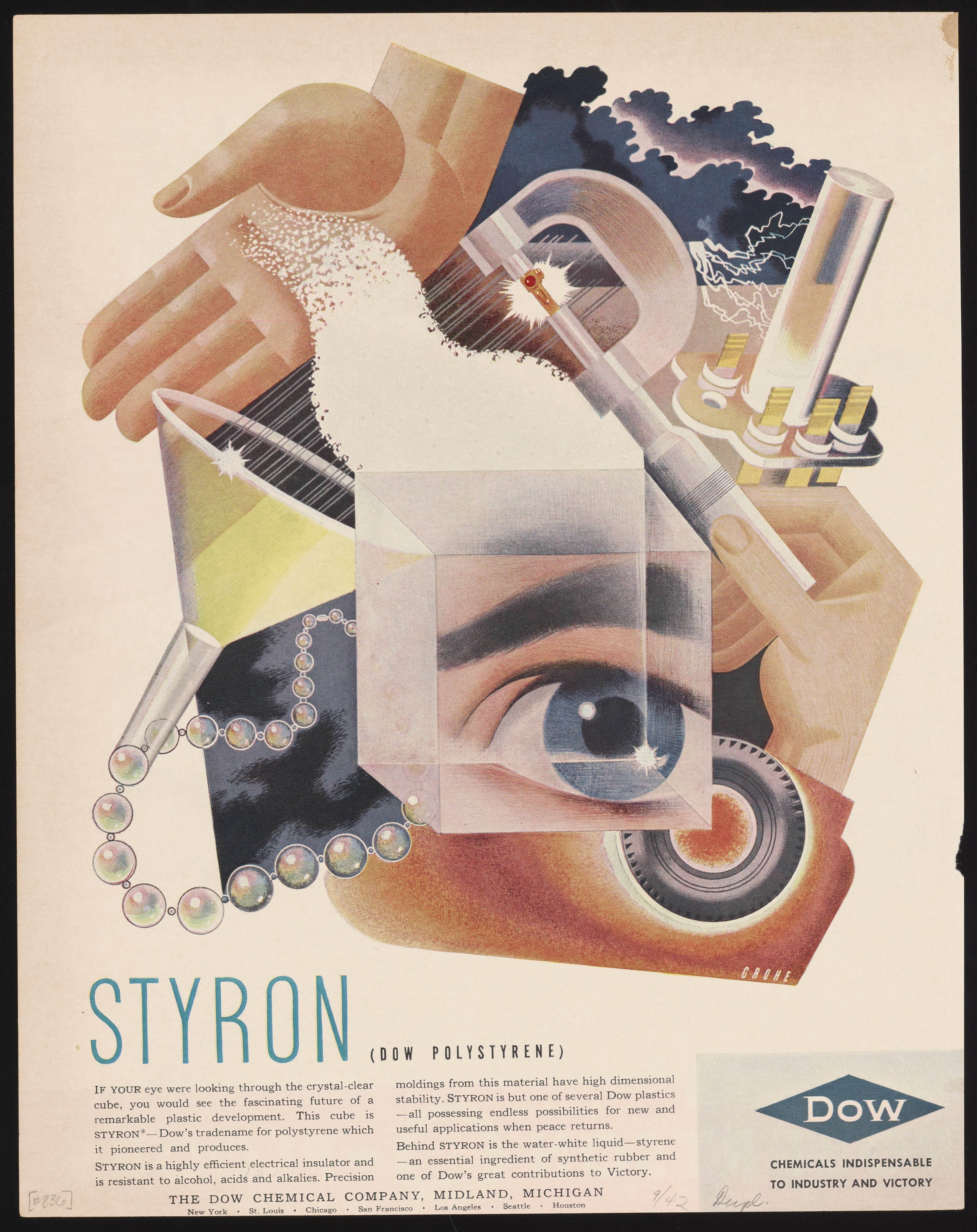 Dow Chemical Company. “Styron (Dow Polystyrene),” 1942. Advertisements from the Dow Chemical Historical Collection, Box 9. Science History Institute. Philadelphia. https://digital.sciencehistory.org/works/dhurdz7.