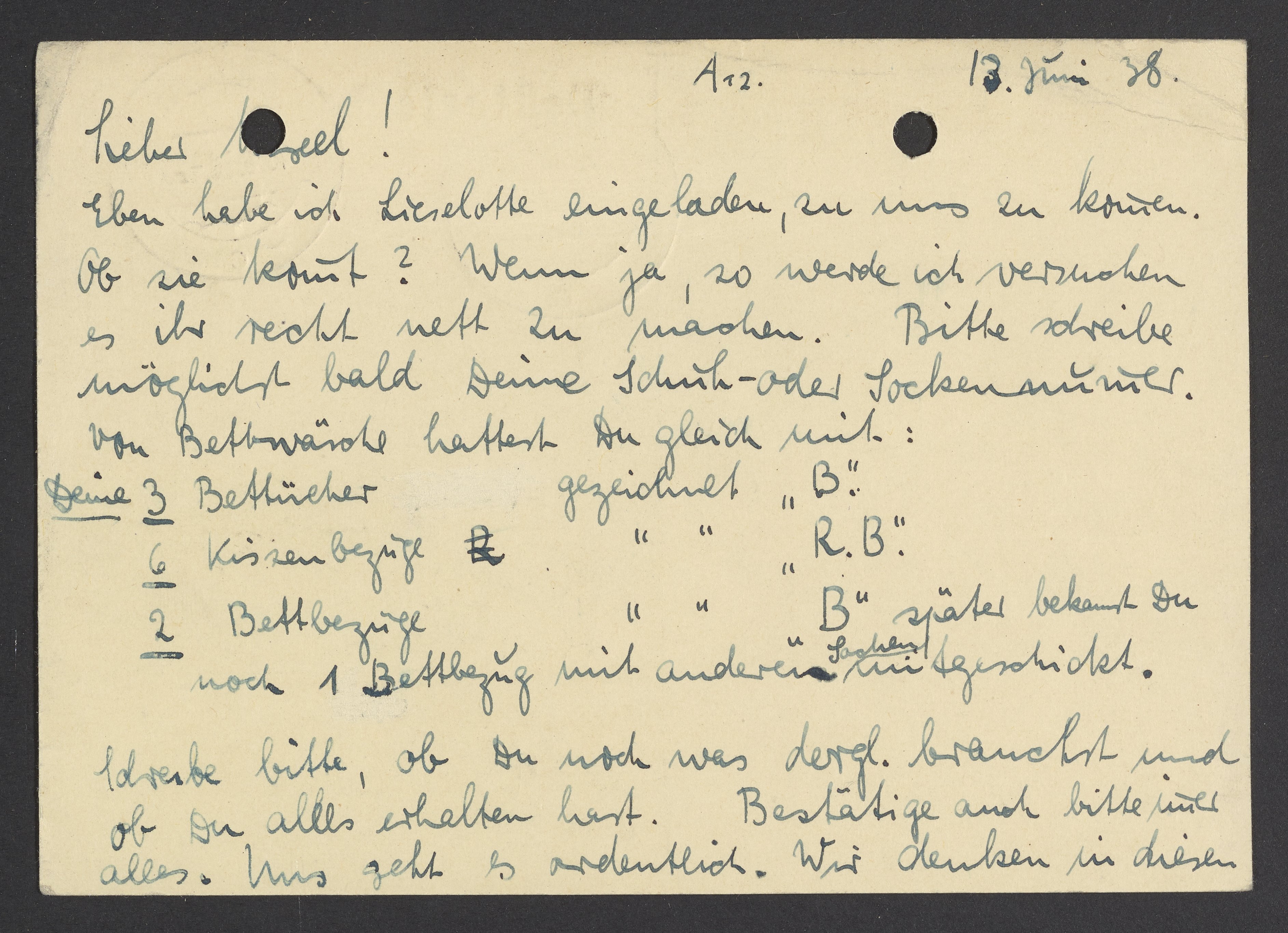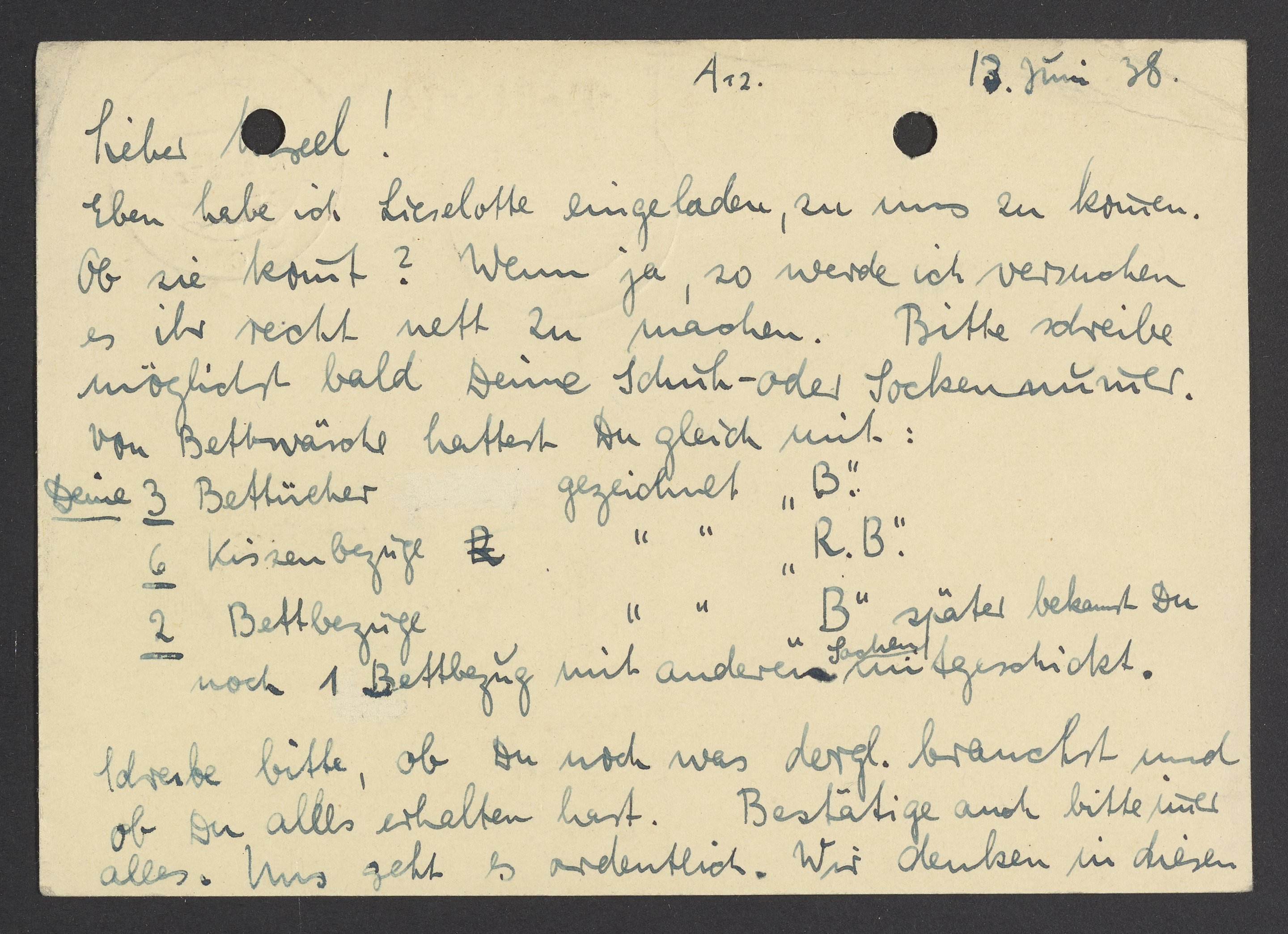 Postcard from Marianne Homburger to Max Bredig, June 13, 1938