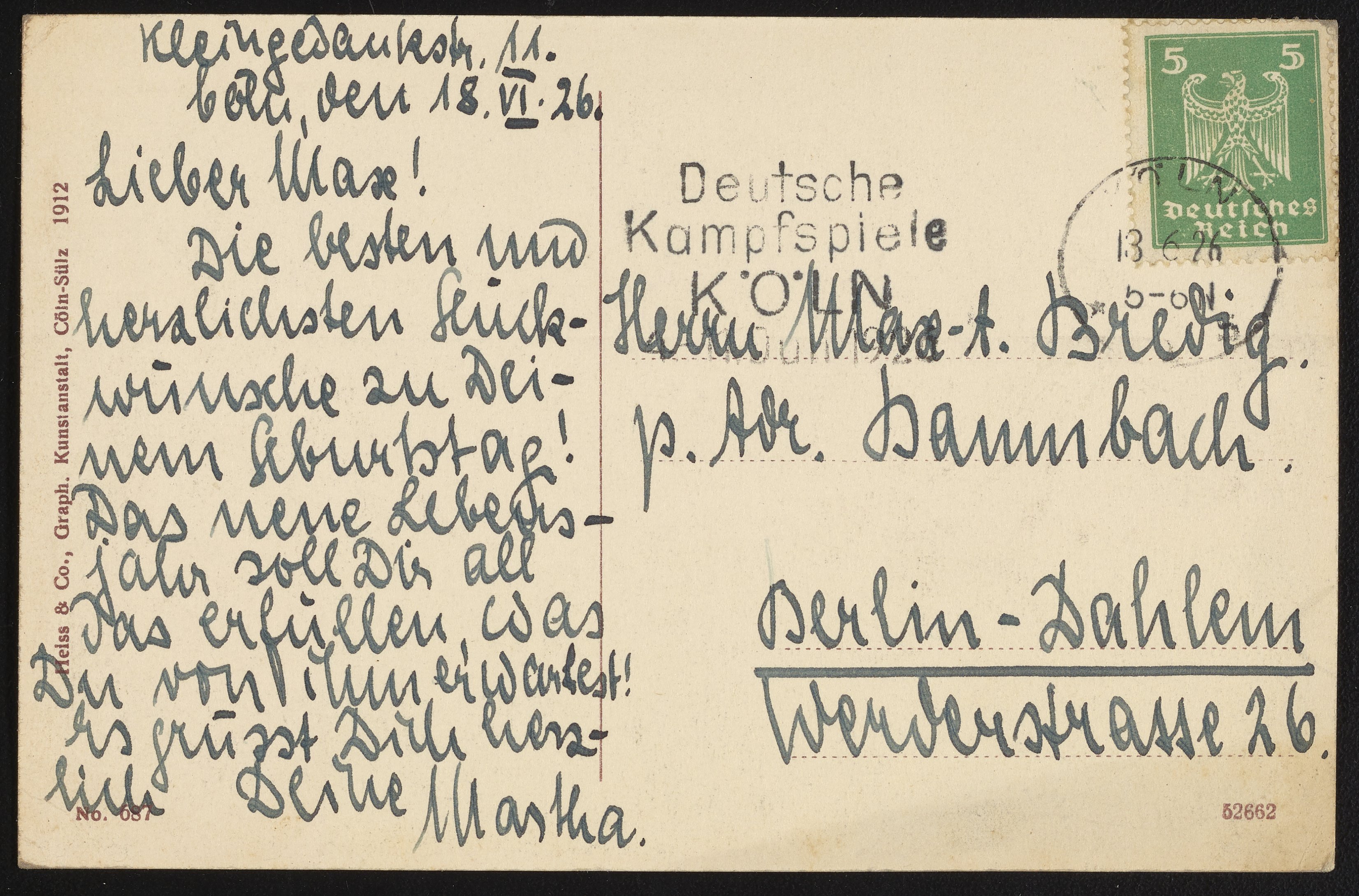 Small JPG1200 x 791px — 251 KBLarge JPG2880 x 1899px — 1.4 MBFull-sized JPG3304 x 2179px — 1.8 MBOriginal fileTIFF — 3304 x 2179px — 20.7 MBPostcard from Martha wishing Max Albert Bredig (1902-1977) a happy birthday. The postcard features an image of the University of Cologne.