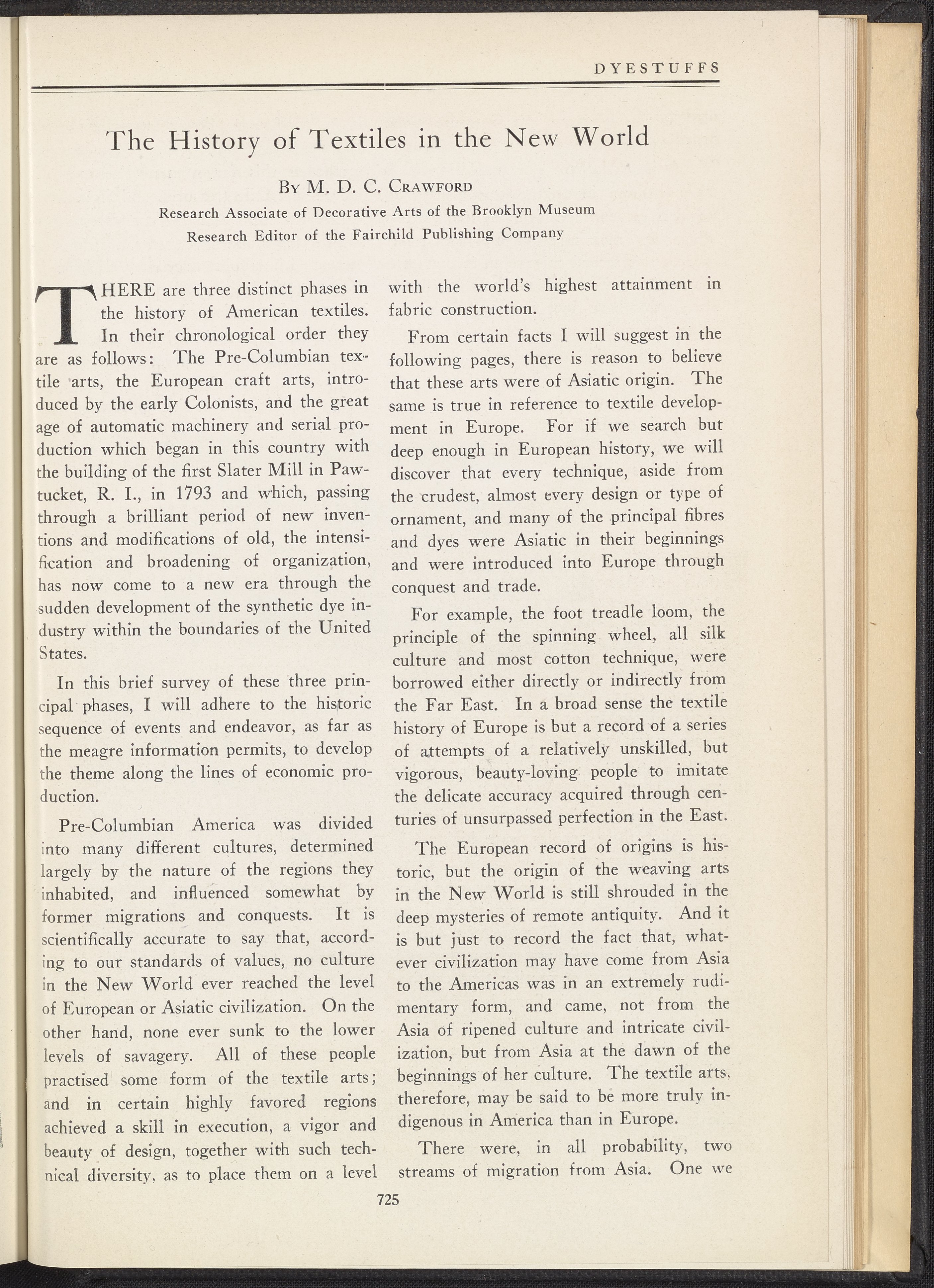 The journal contains reprints of select articles from periodicals in the dyeing and textile fields. This issue is the "Textile Exposition Number" and contains an article by M. D. C. Crawford titled The History of Textiles in the New World in which the author discusses textile arts of indigenous peoples of the Americas. This issue includes black and white printed illustrations.