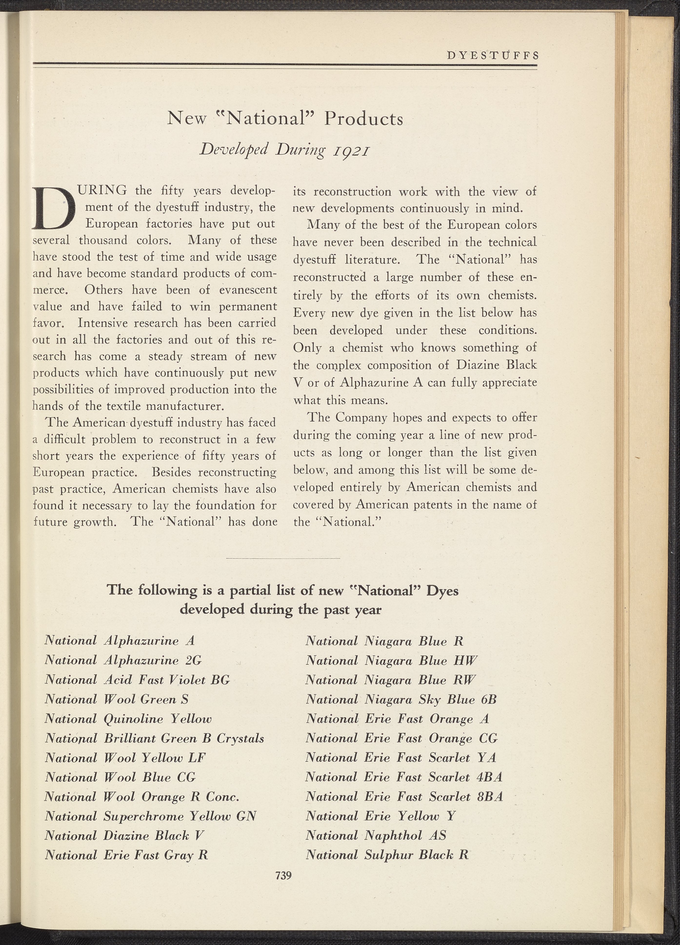 Small JPG1200 x 1680px — 391 KBFull-sized JPG2780 x 3892px — 1.8 MBOriginal fileTIFF — 2780 x 3892px — 31.0 MBEleventh issue from the twenty-second volume of Dyestuffs, a journal publication from the National Aniline Division of the Allied Chemical & Dye Corporation issued on a monthly to quarterly basis from 1898 to 1964 (suspended briefly from 1916 to 1917).