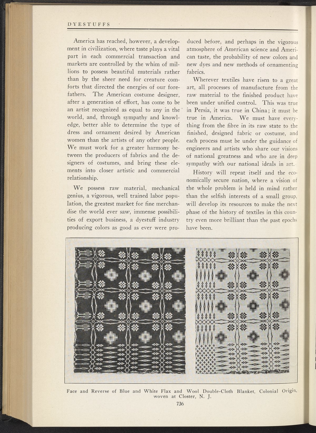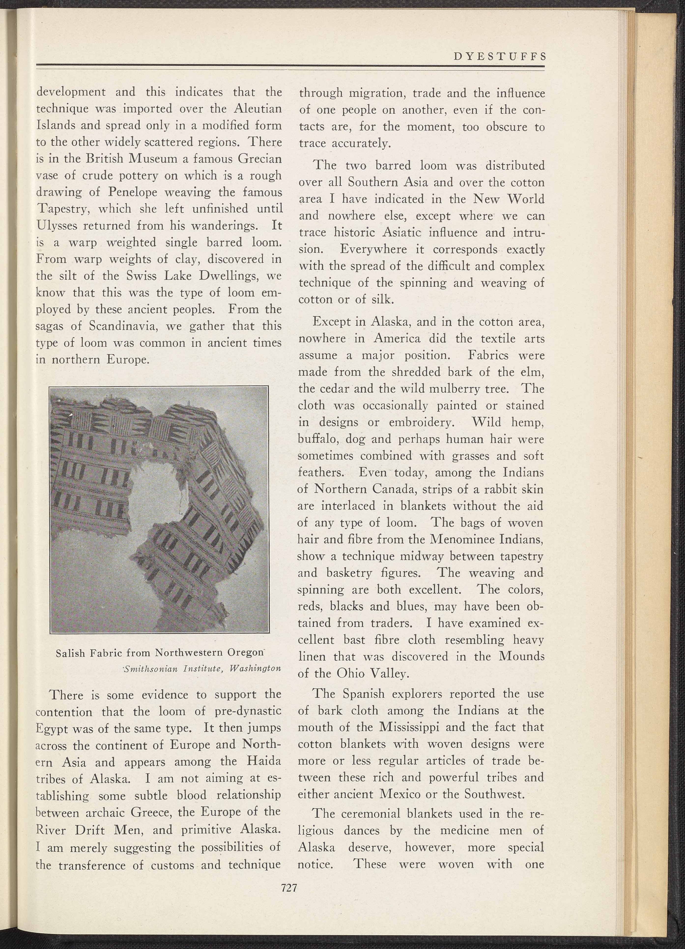 The journal contains reprints of select articles from periodicals in the dyeing and textile fields. This issue is the "Textile Exposition Number" and contains an article by M. D. C. Crawford titled The History of Textiles in the New World in which the author discusses textile arts of indigenous peoples of the Americas. This issue includes black and white printed illustrations.