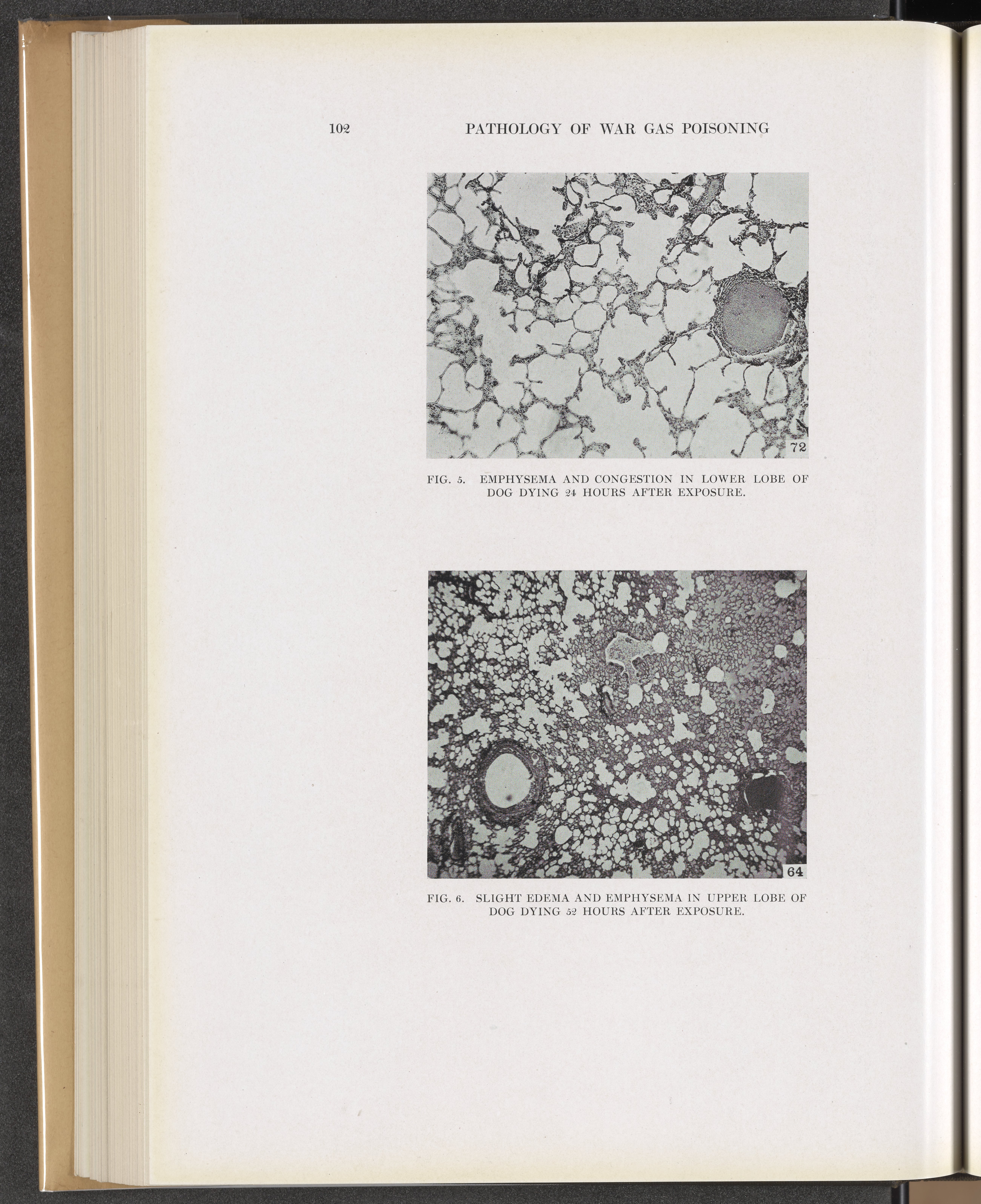 Fig. 5: Emphysema and congestion in lower lobe of dog dying 24 hours after exposure. Fig. 6: Slight edema and emphysema in upper lobe of dog dying 52 hours after exposure.