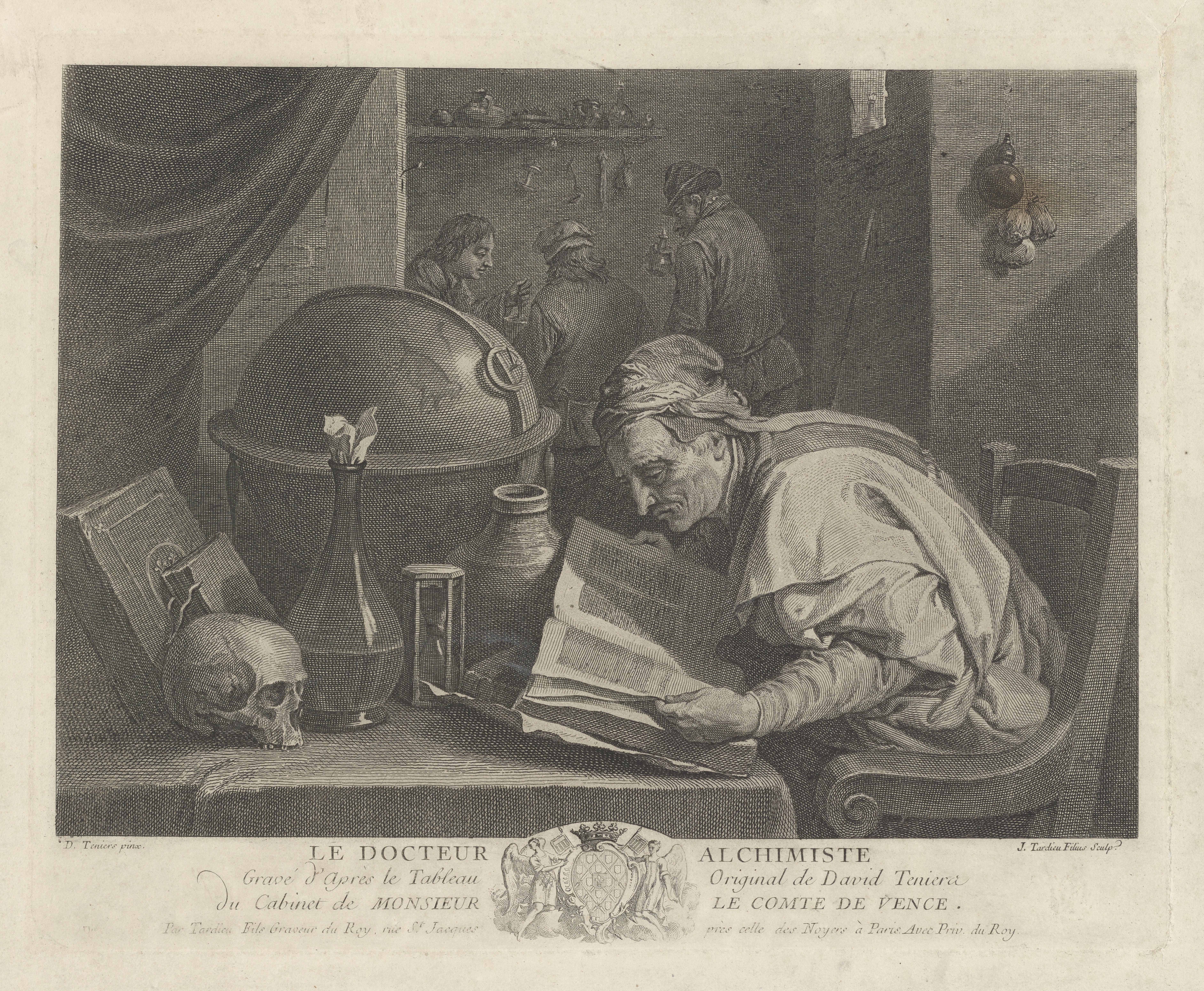 This engraving by J. Tardieu reproduces a painting of the same subject by David Teniers II. An older man with a lined, wizened face sits in a chair before a table, intently reading an open book. Before him sits a globe, hourglass and a human skull, reminders of both worldly knowledge and the passage of time. Other texts rest nearby. In the background, three men converse in the workshop, beneath a shelf of glassware and stoppered flasks.