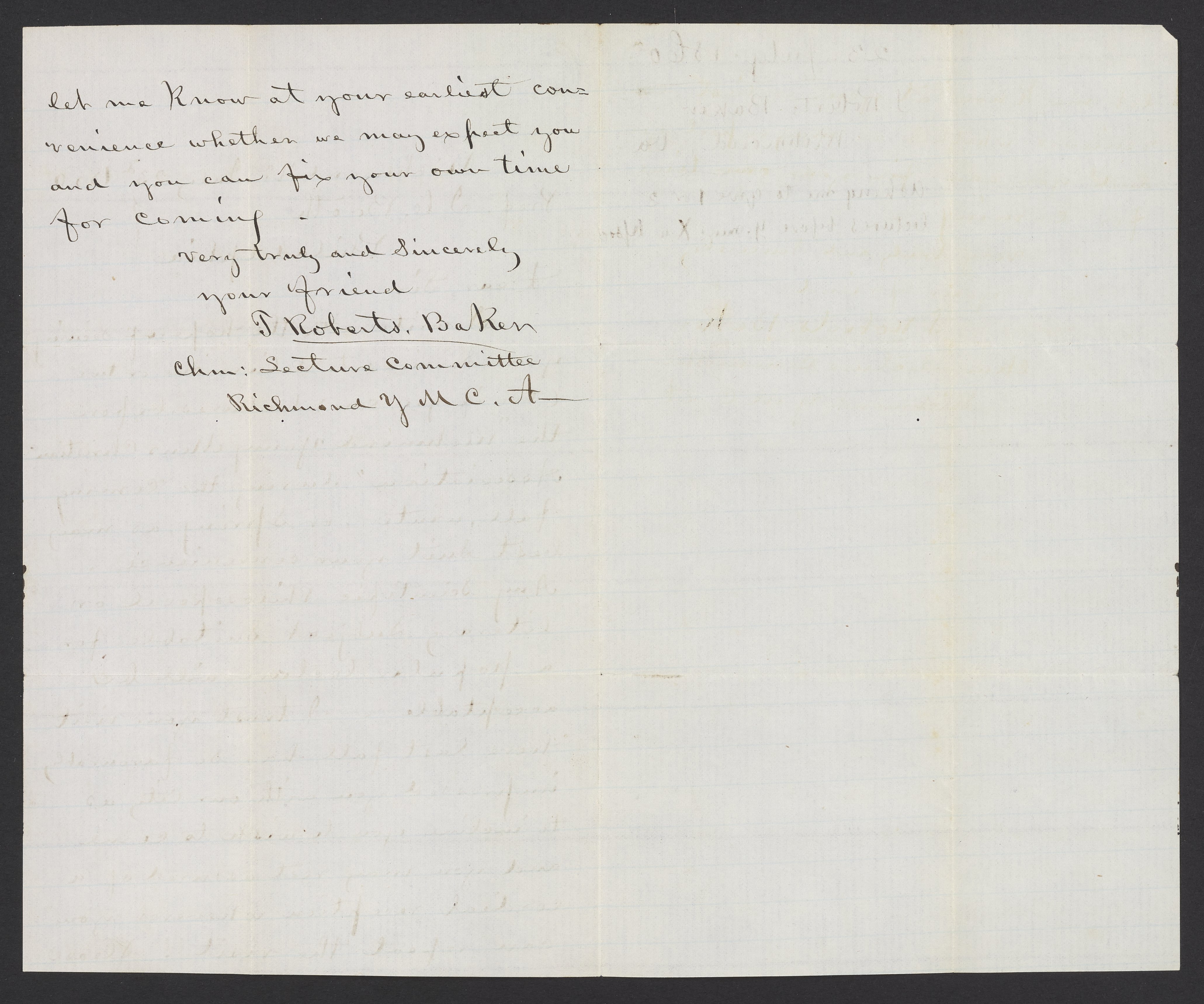 Small JPG1200 x 1937px — 318 KBFull-sized JPG2130 x 3438px — 863 KBOriginal fileTIFF — 2130 x 3438px — 21.0 MBT. Roberts Baker asks James Curtis Booth (1810-1888) to give one or two lectures before the Young Men's Christian Association (Y.M.C.A.).