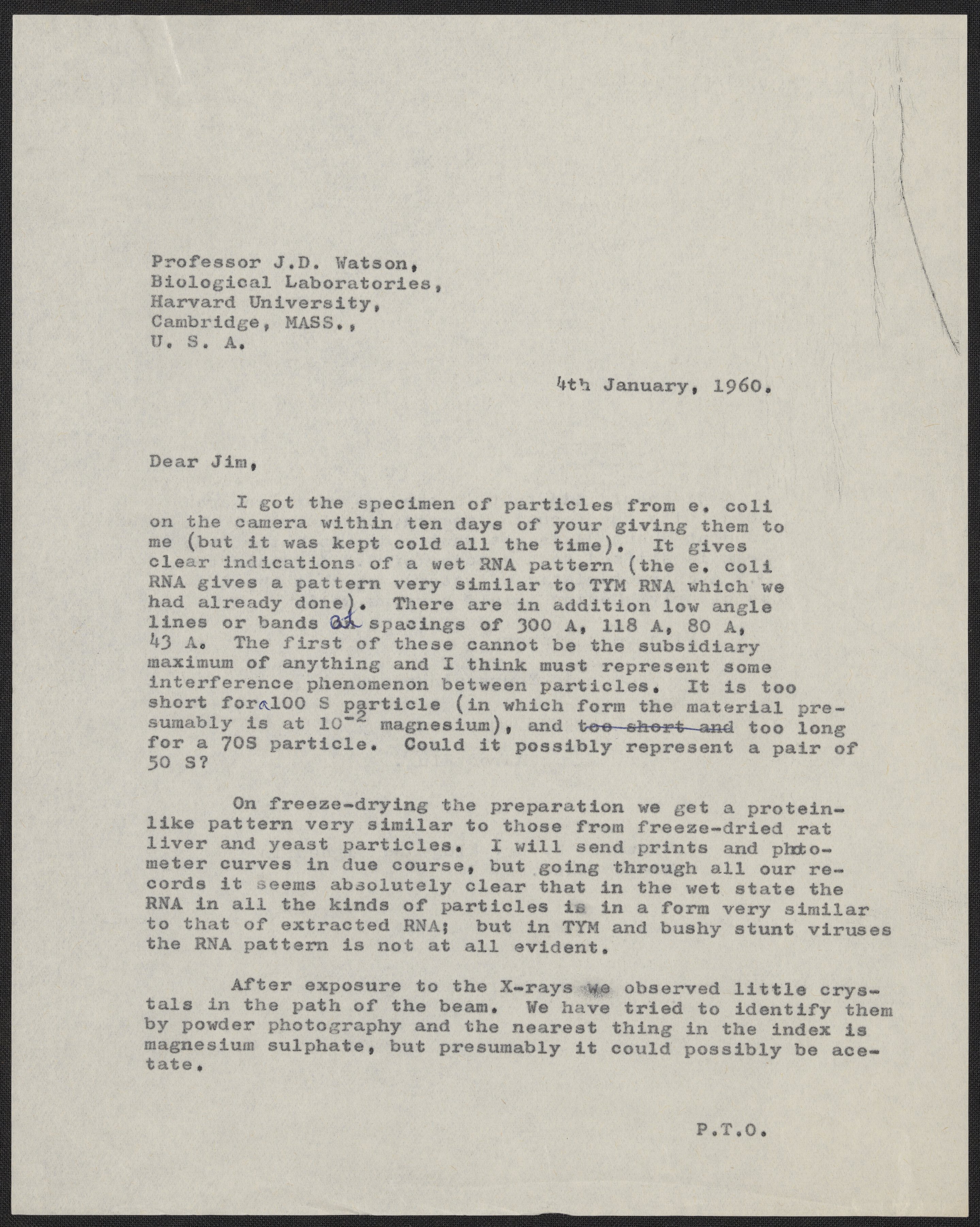Klug, A. (Aaron), Sir. “Letter from Aaron Klug to James Watson, January 4, 1960,” January 4, 1960. History of Molecular Biology Collection, Box 28, Folder 8. Science History Institute. Philadelphia. https://digital.sciencehistory.org/works/dliro0a.