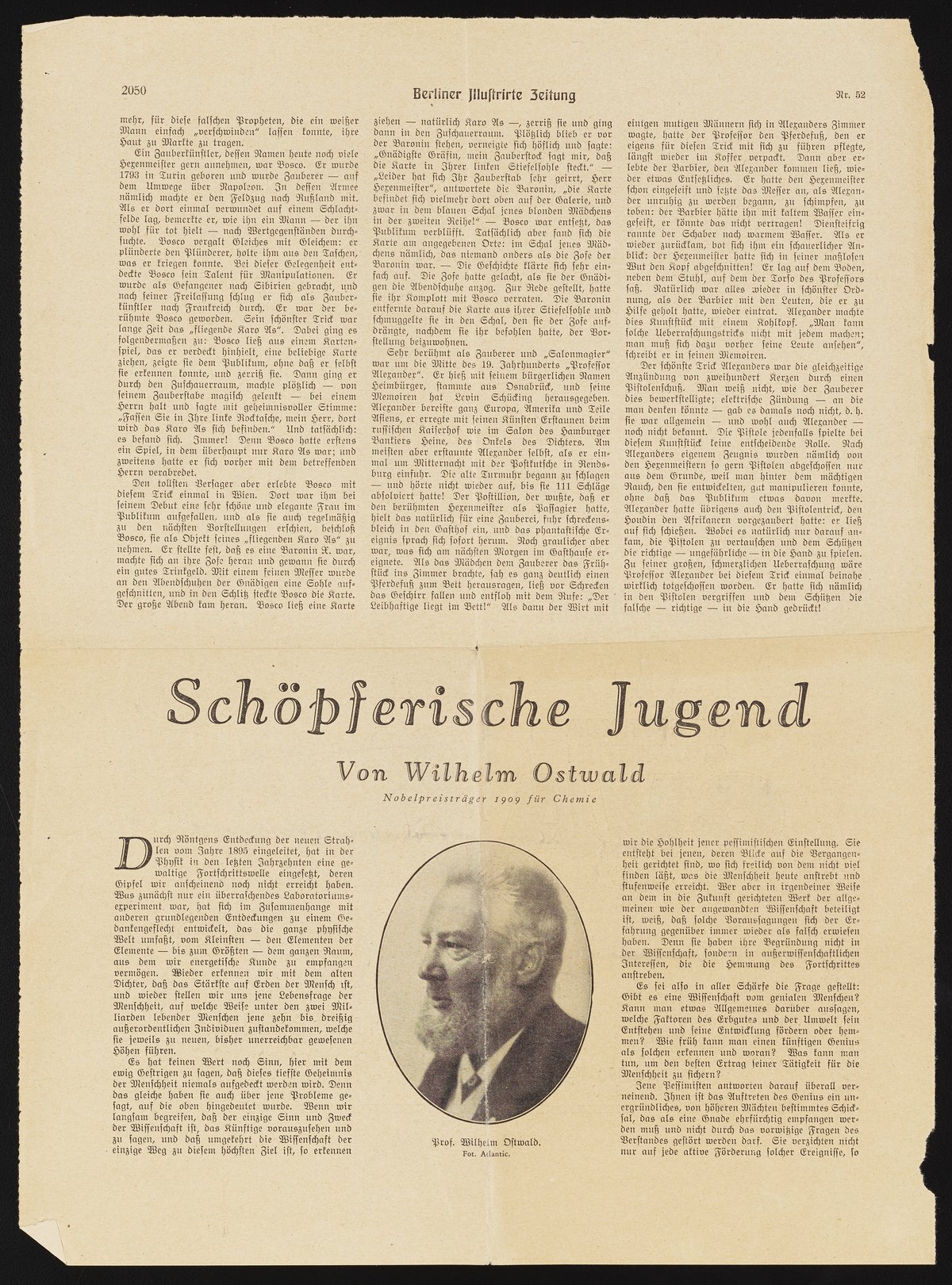 Ostwald, Wilhelm. “Schöpferische Jugend.” Berliner Zeitung (Berlin, Germany : East), December 25, 1931. Papers of Georg and Max Bredig, Box 6, Folder 5. Science History Institute. Philadelphia. https://digital.sciencehistory.org/works/dlzmfmt.