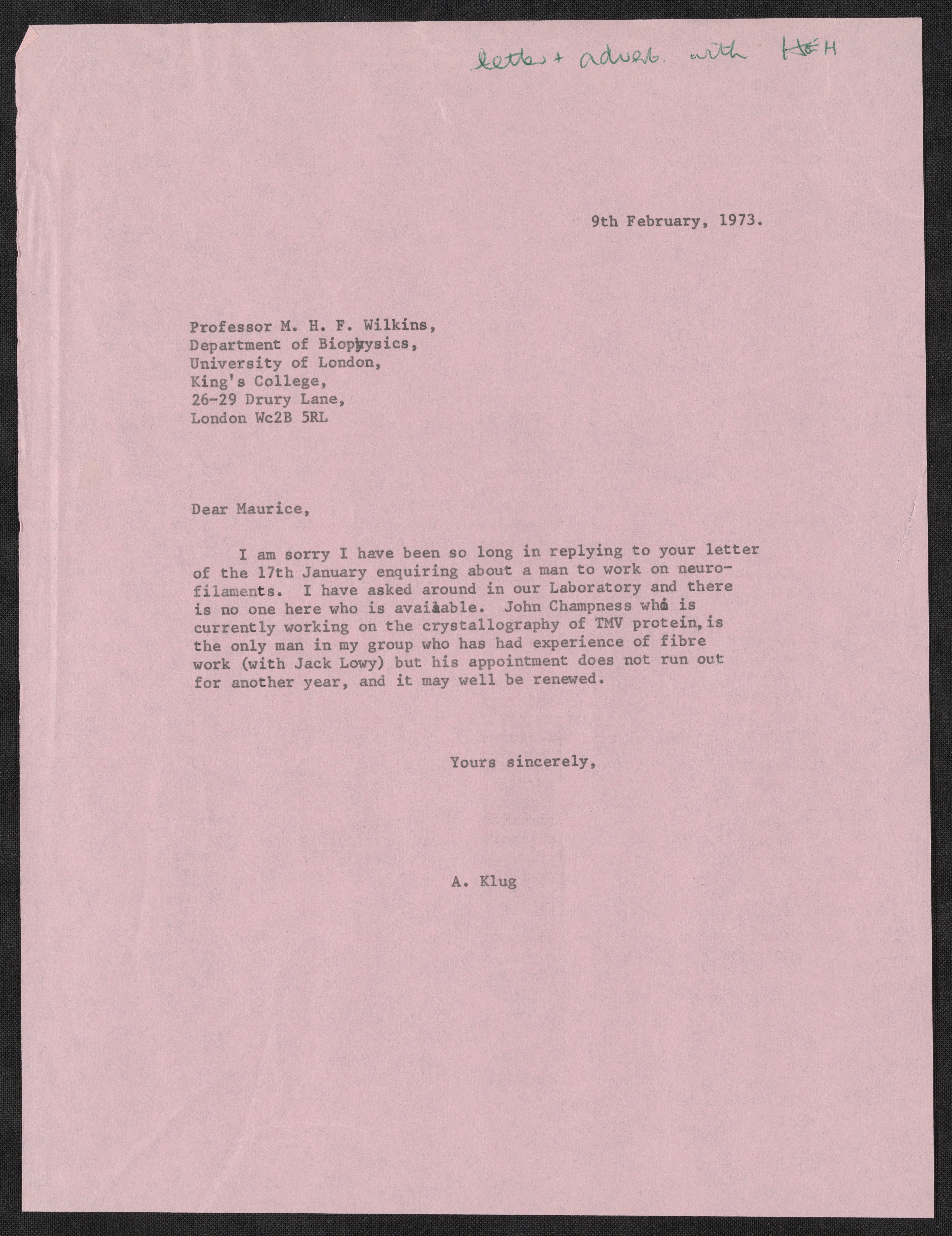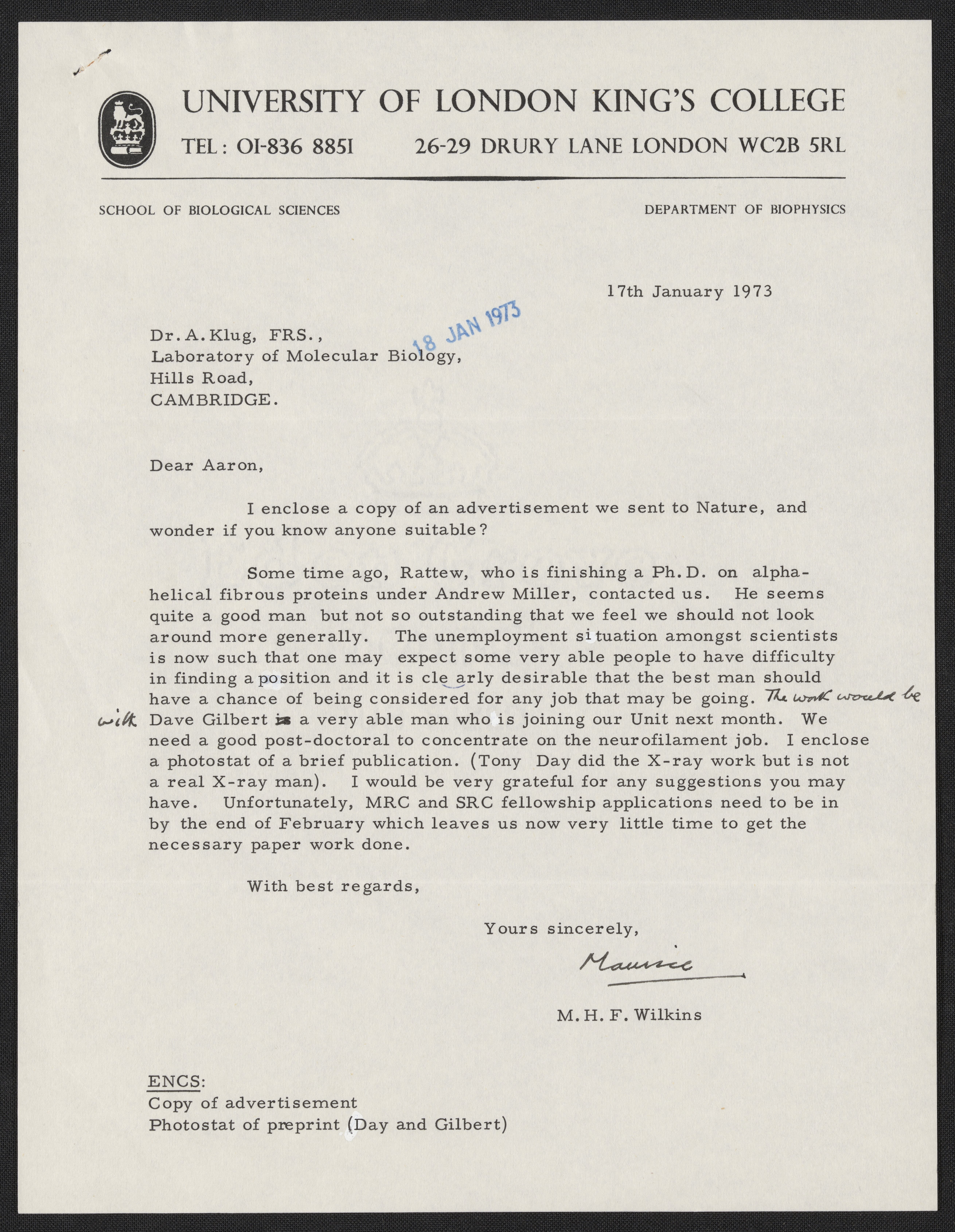 Letters between Maurice Wilkins and Aaron Klug, January and February 1973