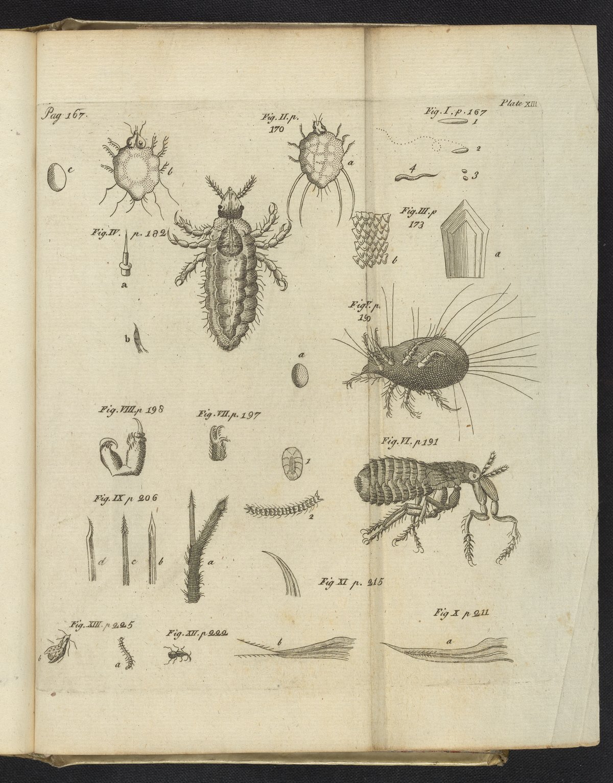 Plate XIII: Animalcules of the teeth; scabies/skin/lice/snake tooth and various insects under magnification