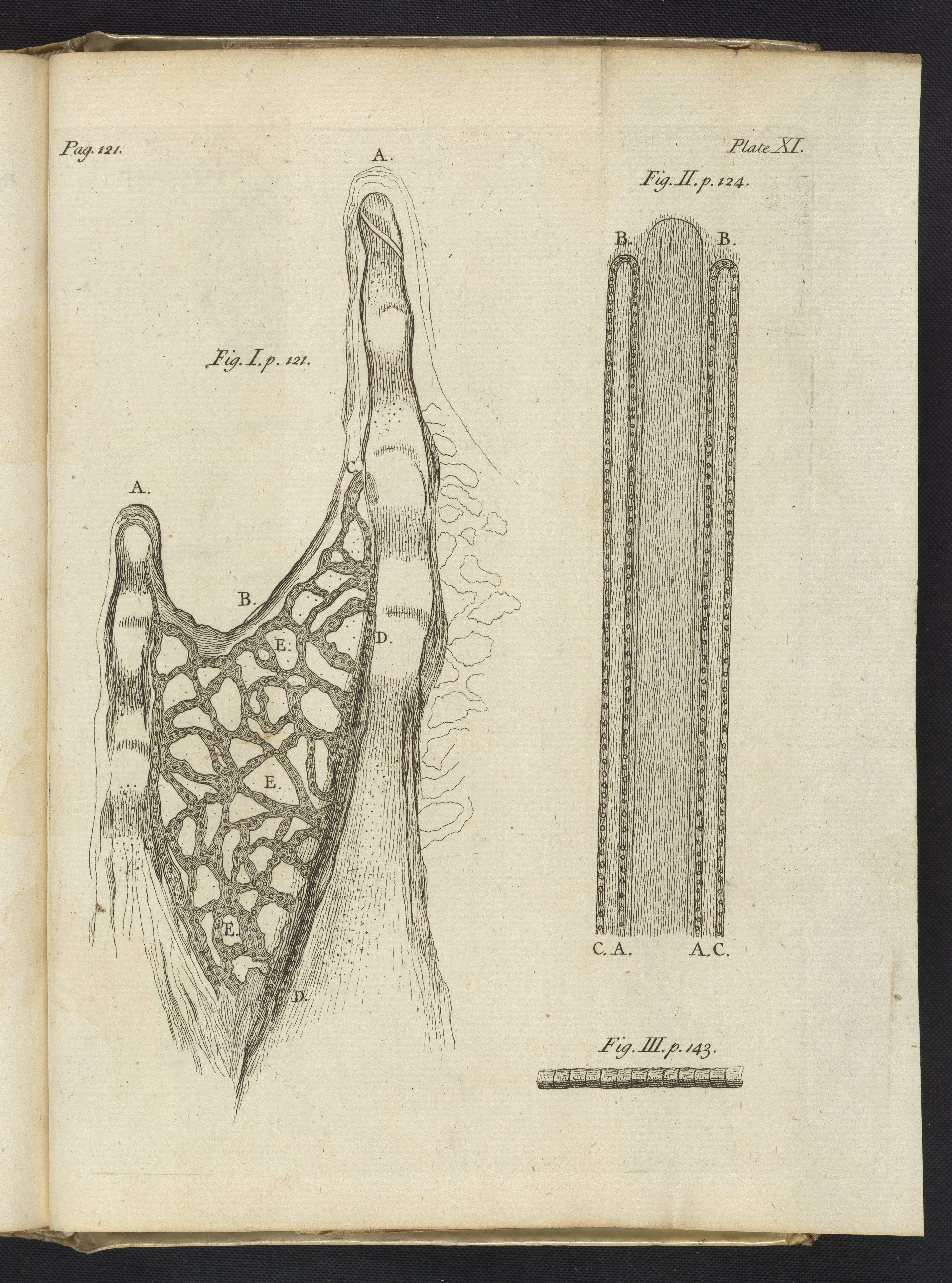 Baker, Henry. “Plate XI: Frog's Foot, Fish's Tail and Leg of Fly/Gnat/Ant under Magnification.” In The Microscope Made Easy. London, England: Robert Dodsley, 1743. https://digital.sciencehistory.org/works/dpq7sa0.