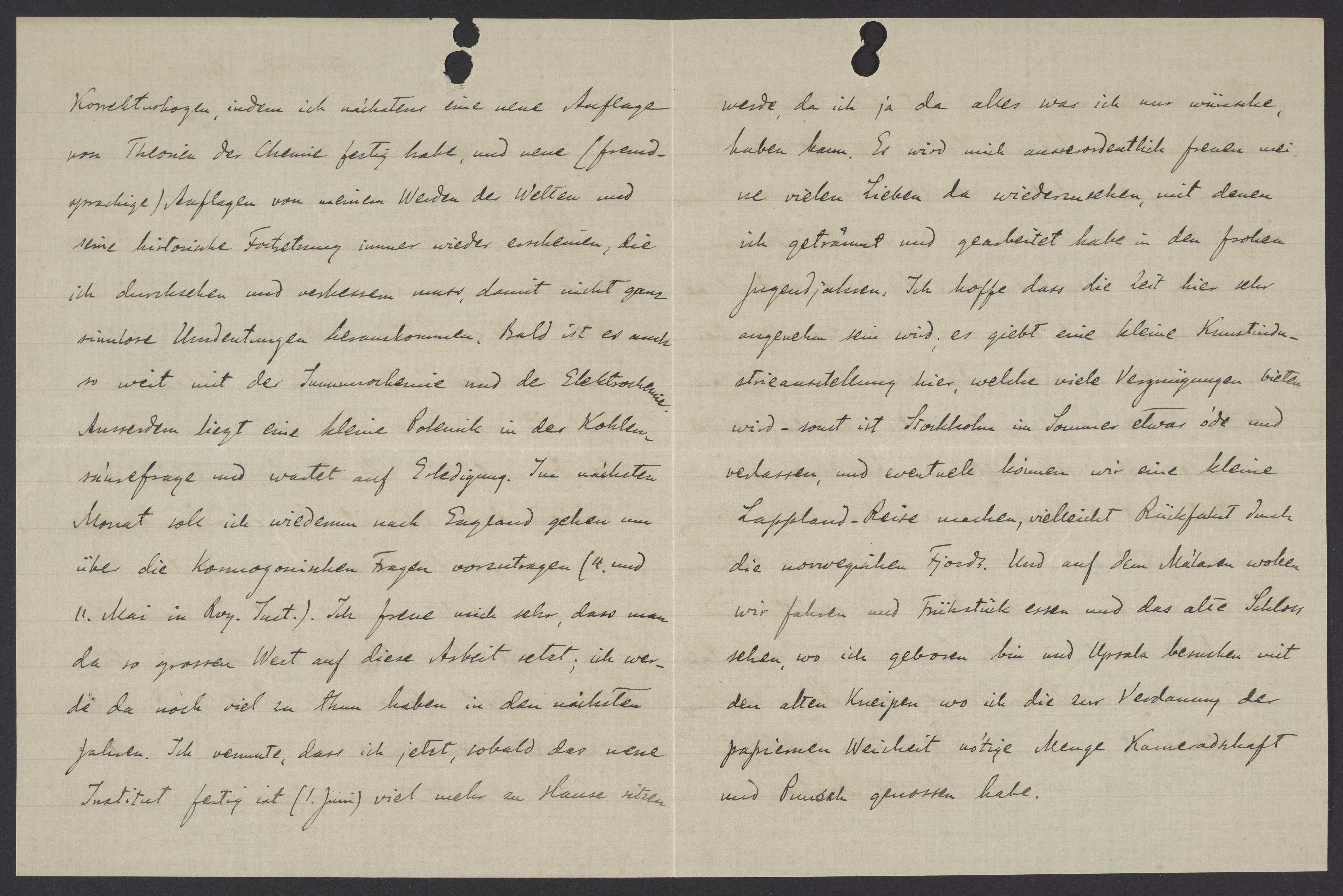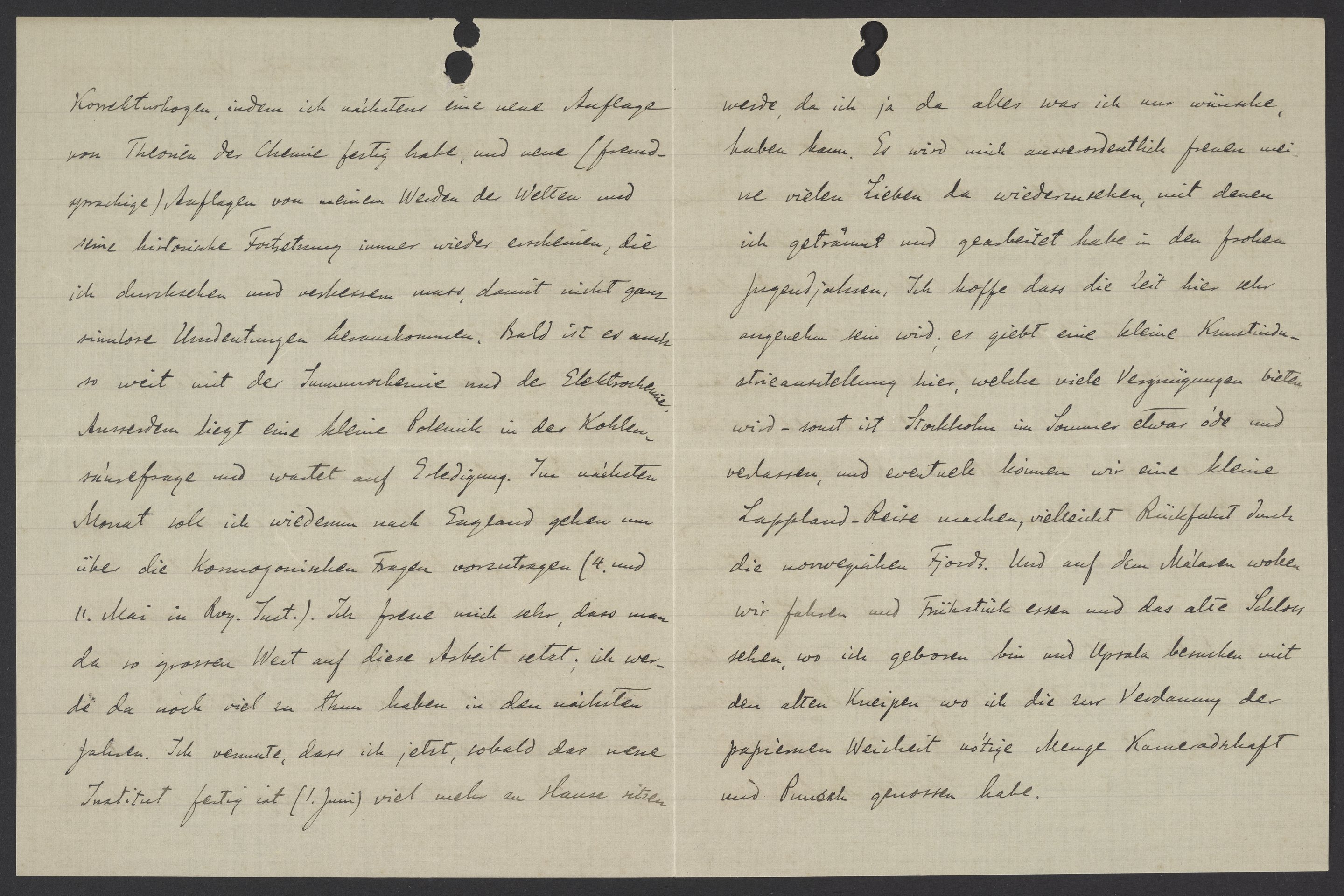 Korrekturbogen, indem ich nächstens eine neue Auflage von Theorien der Chemie fertig habe, und neue (fremdsprachige) Auflagen von meinen Werden der Welten und seine historische Forsetzung immer wieder erscheinen, die ich durchsehen und verbessern muss, damit nicht ganz sinnlose Undeutungen herauskommen. Bald ist es auch so weit mit der Immunochemie und der Elektrochemie. Ausserdem liegt eine kleine Polemik in der Kohlensäurefrage und wartet auf Erledigung. Im nächsten Monat soll ich wiederum nach England gehen um über die Kosmogonischen Fragen vorzutragen (4. Und 11. Mai in Roy. Inst.). Ich freue mich sehr, dass man da so grossen Wert auf diese Arbeit setzt; ich werde da noch viel zu thun haben in den nächsten Jahren. Ich vermute, dass ich jetzt, sobald das neue Institut fertig ist (1. Juni) viel mehr zu Hause sitzen