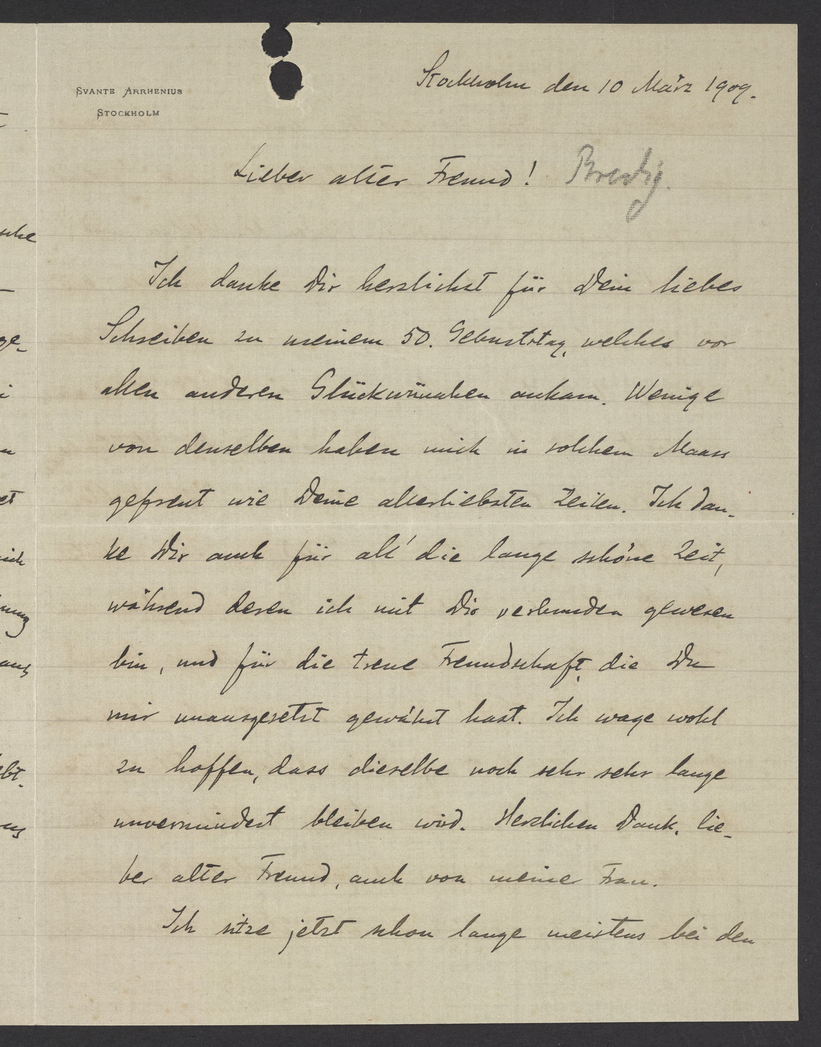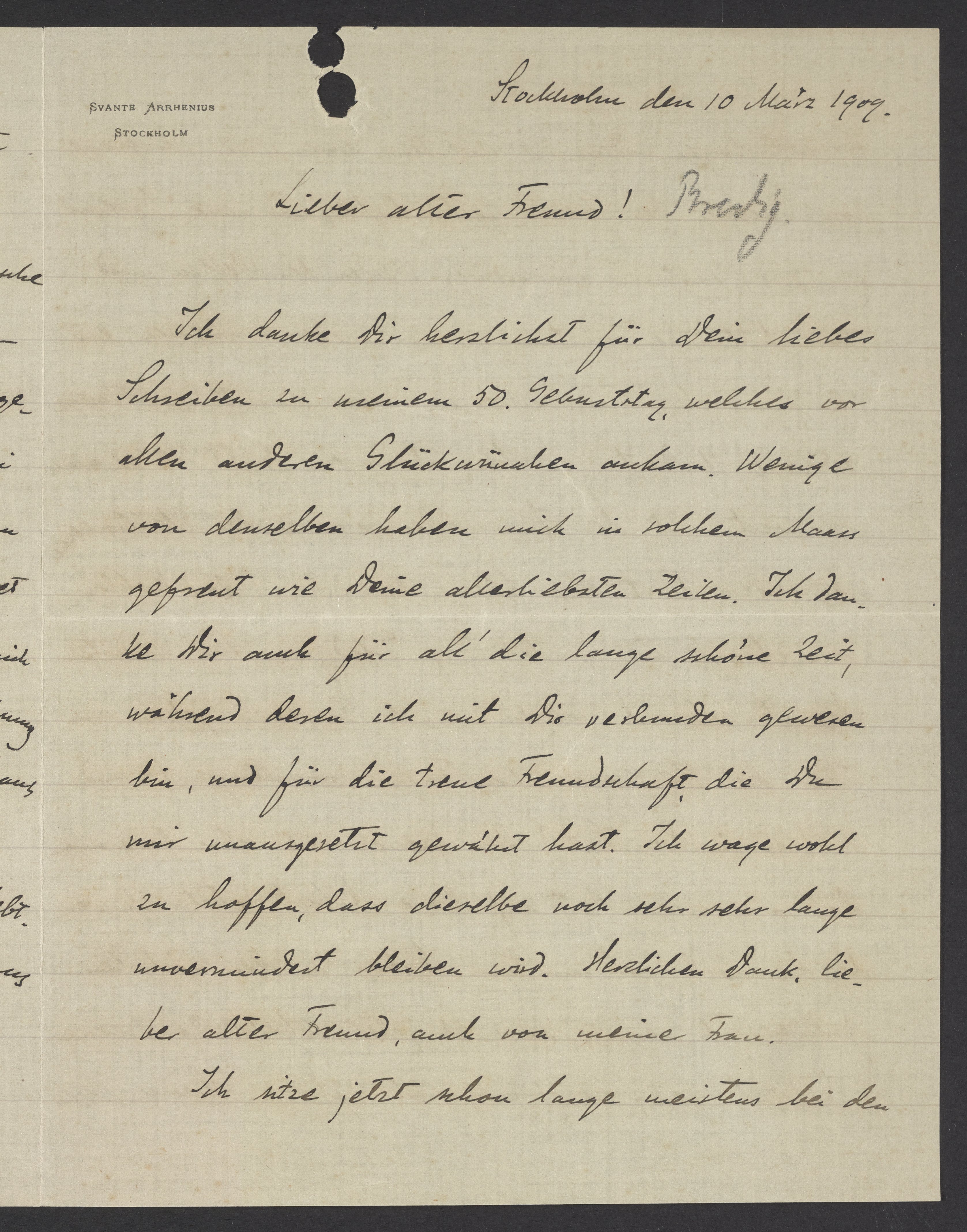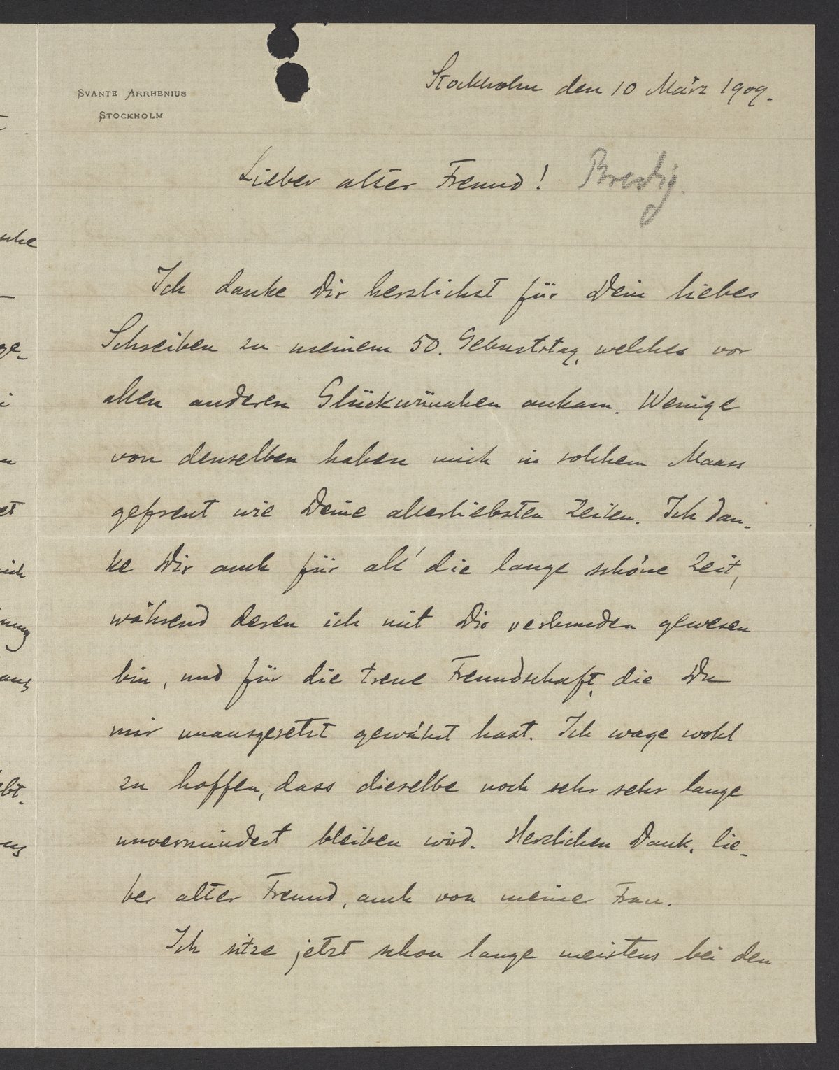 Small JPG1200 x 1530px — 314 KBLarge JPG2880 x 3671px — 1.7 MBFull-sized JPG3354 x 4275px — 2.2 MBOriginal fileTIFF — 3354 x 4275px — 41.1 MBSvante Arrhenius (1859-1927) writes to Georg Bredig (1868-1944) to thank him for his many years of friendship. Arrhenius updates Bredig on his personal life and tells him how he celebrated his 50th birthday.