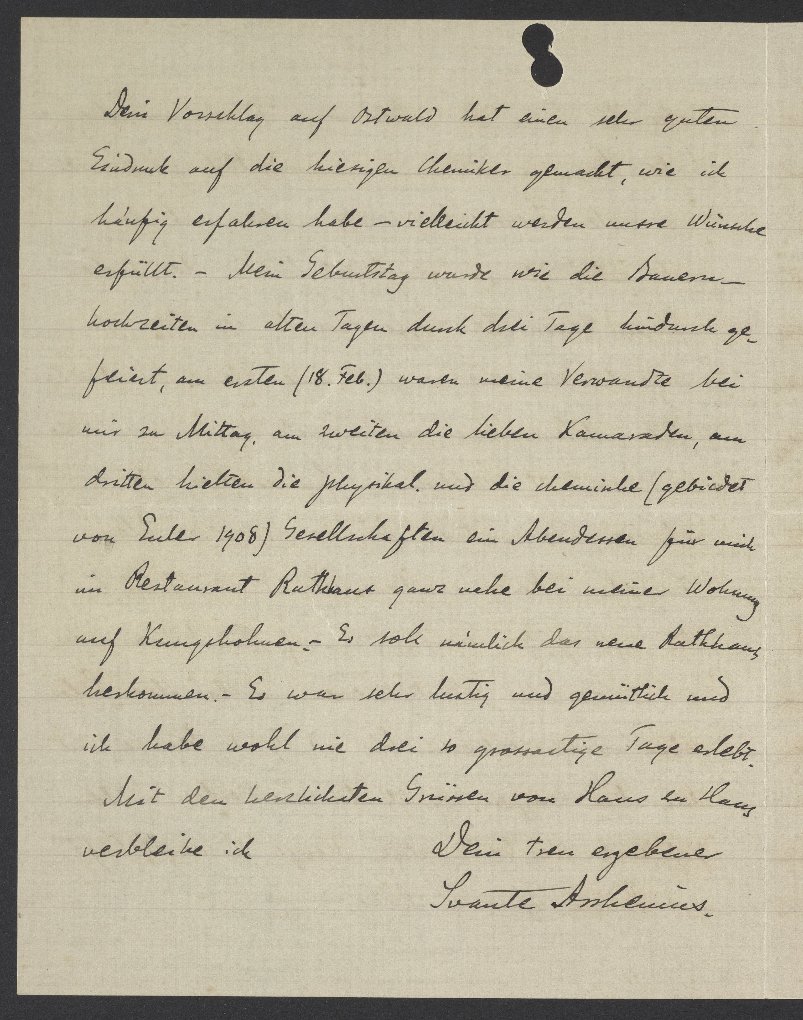 Dein Vorschlag auf Ostwald hat einen sehr guten Eindruck auf die hiesigen Chemiker gemacht, wie ich häufig erfahren habe – vielleicht werden unsere Wünsche erfüllt. Mein Geburtstag wurde wie die Bauernhochzeiten in alten Tagen durch drei Tage hindurch gefeiert, am ersten (18. Feb.) waren meine Verwandte bei mir zu Mittag, am zweiten die lieben Kameraden, am dritten hielten die physikal. und die chemische (gebildet von Euler 1908) Gesellschaften ein Abendessen für mich im Restaurant Rathaus ganz nahe bei meiner Wohnung auf Kungsholmen. Es soll nämlich das neue Rathhaus herkommen. Es war sehr lustig und gemütlich und ich habe wohl nie dre so grossartige Tage erlebt.