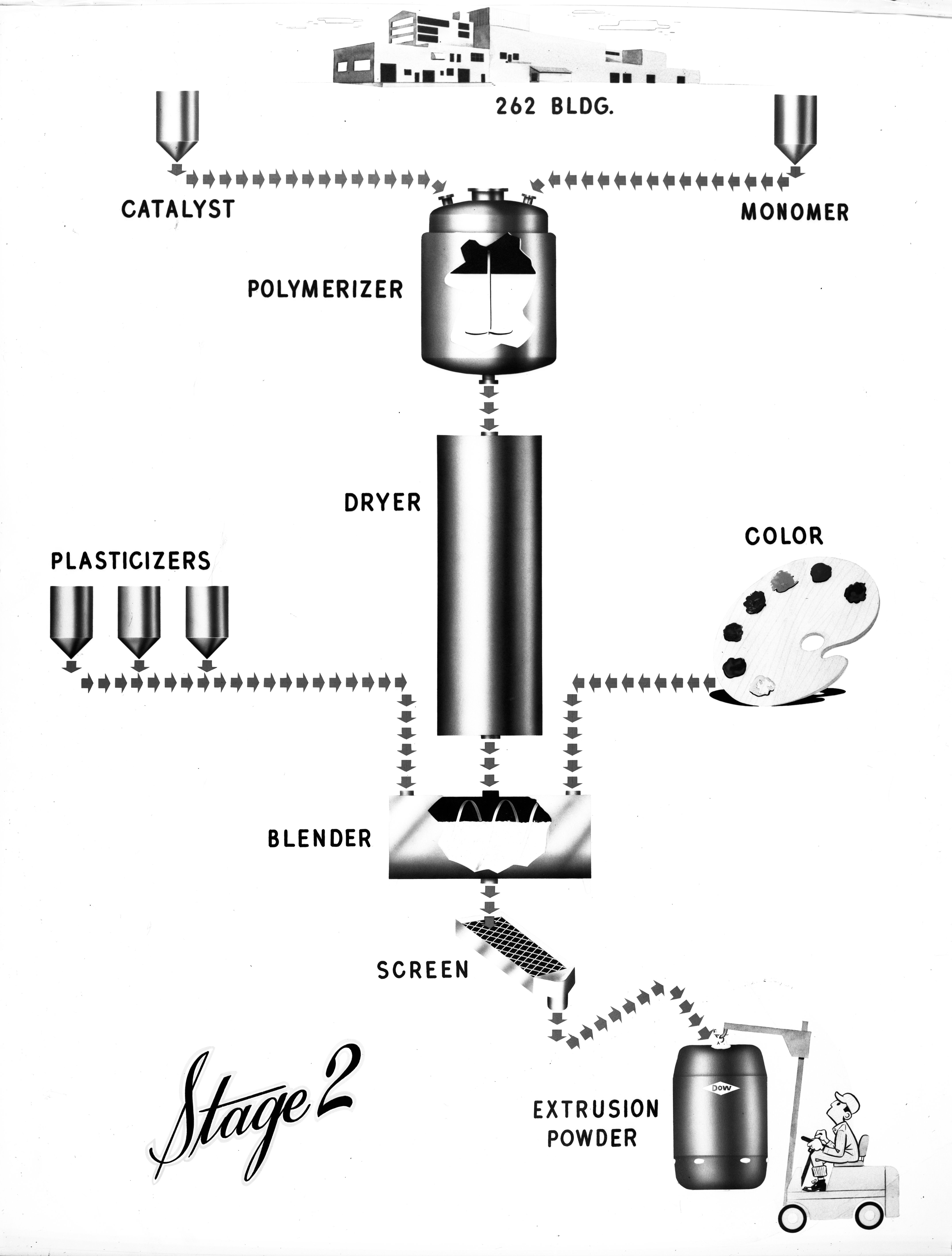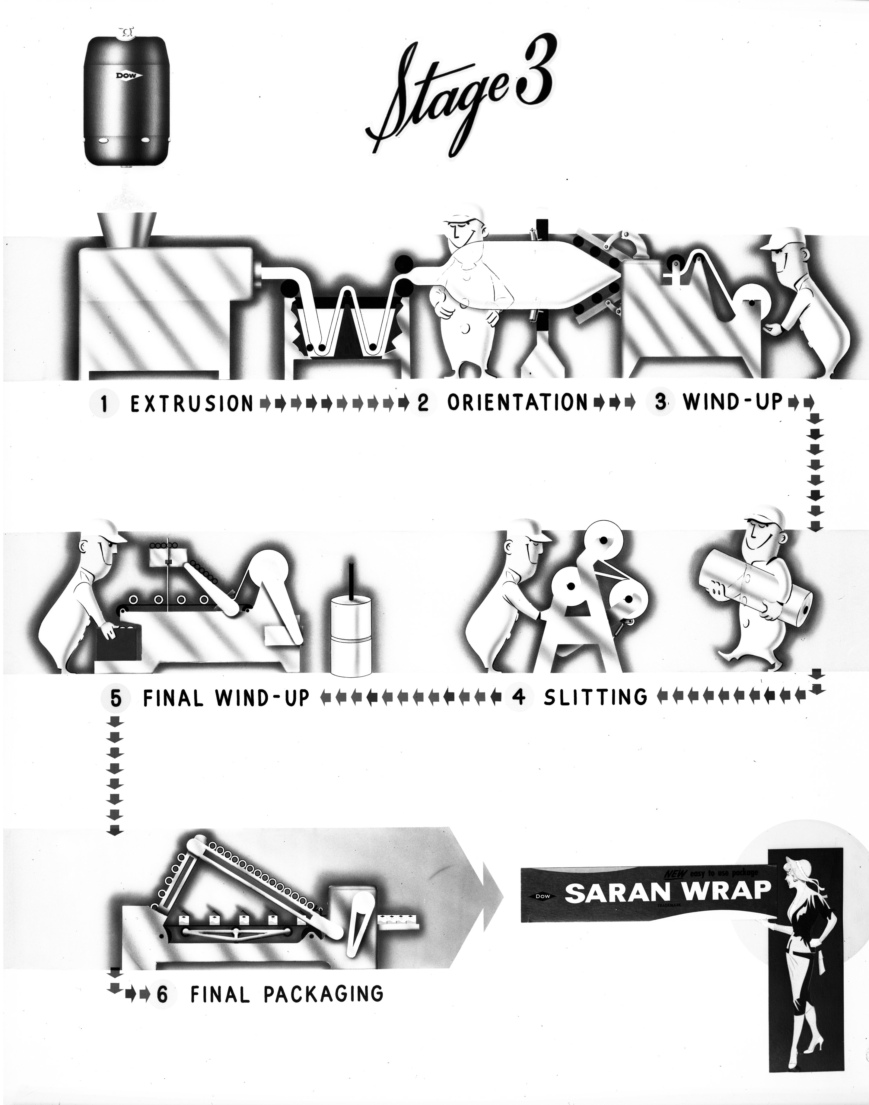 Small JPG1200 x 1521px — 157 KBLarge JPG2880 x 3652px — 581 KBFull-sized JPG4487 x 5689px — 1.1 MBOriginal fileTIFF — 4487 x 5689px — 24.4 MBIllustrated depiction of the production of Saran Wrap at the Dow Chemical Company in three stages. Stage 1 depicts the harvesting of raw materials, including petroleum and brine, and the manufacture of assorted intermediaries at the Dow facilities in Freeport, Texas. In Stage 2, the resulting monomers are processed in the 262 Building at the Dow plant in Midland, Michigan in order to create an extrusion powder. Finally, in Stage 3, the powder is extruded into saran film and packaged as Saran Wrap for consumer sale.