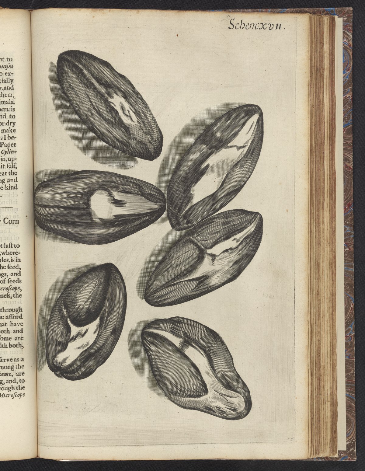 Engravings from Schem. 17 of the first edition of Robert Hooke's seminal volume, Micrographia : or, Some physiological descriptions of minute bodies made by magnifying glasses. With observations and inquiries thereupon. Depicted here are an assortment of seeds of the Venus looking-glass or corn violet that are the subject of Hooke's experiments in Observ. XXVIII.