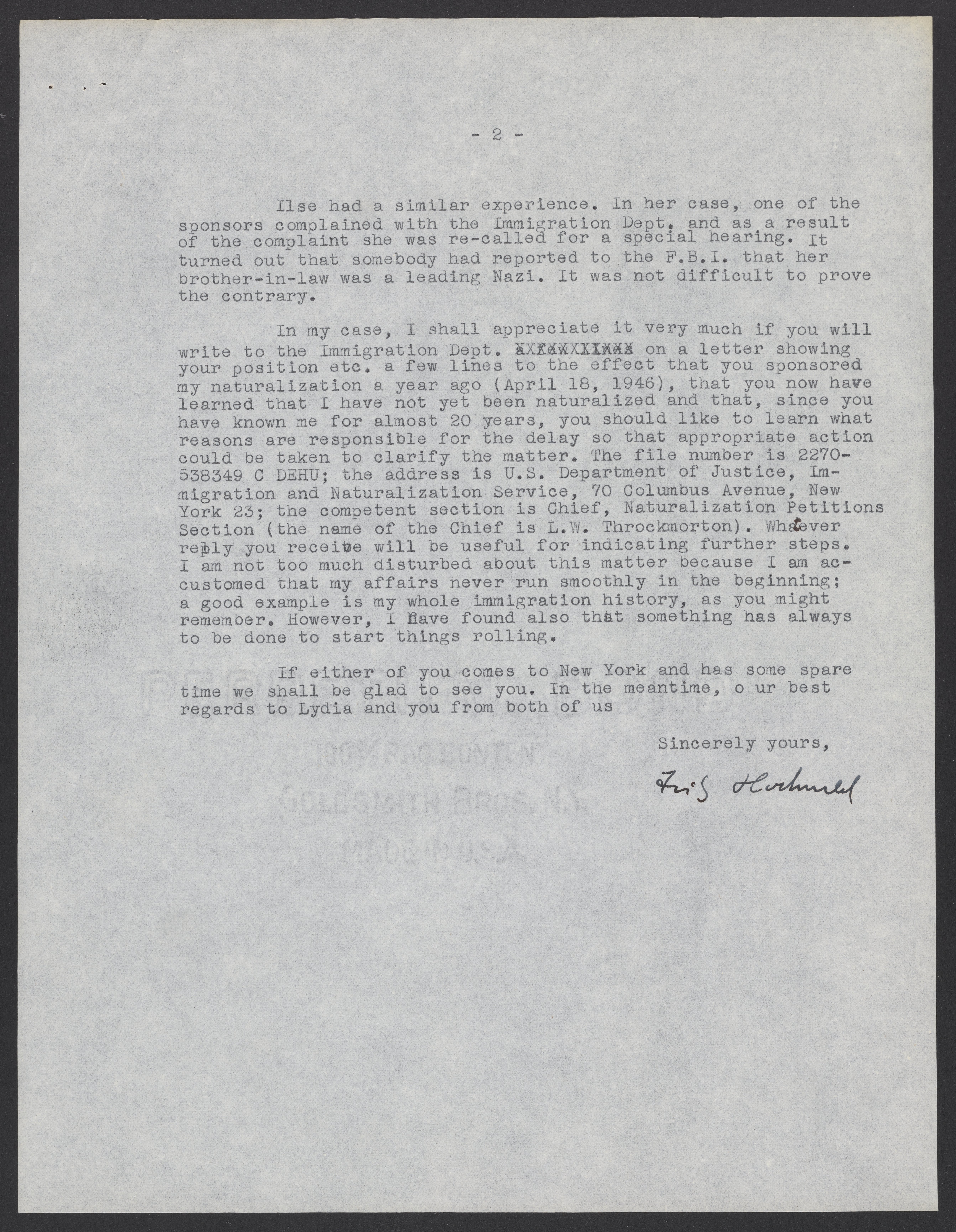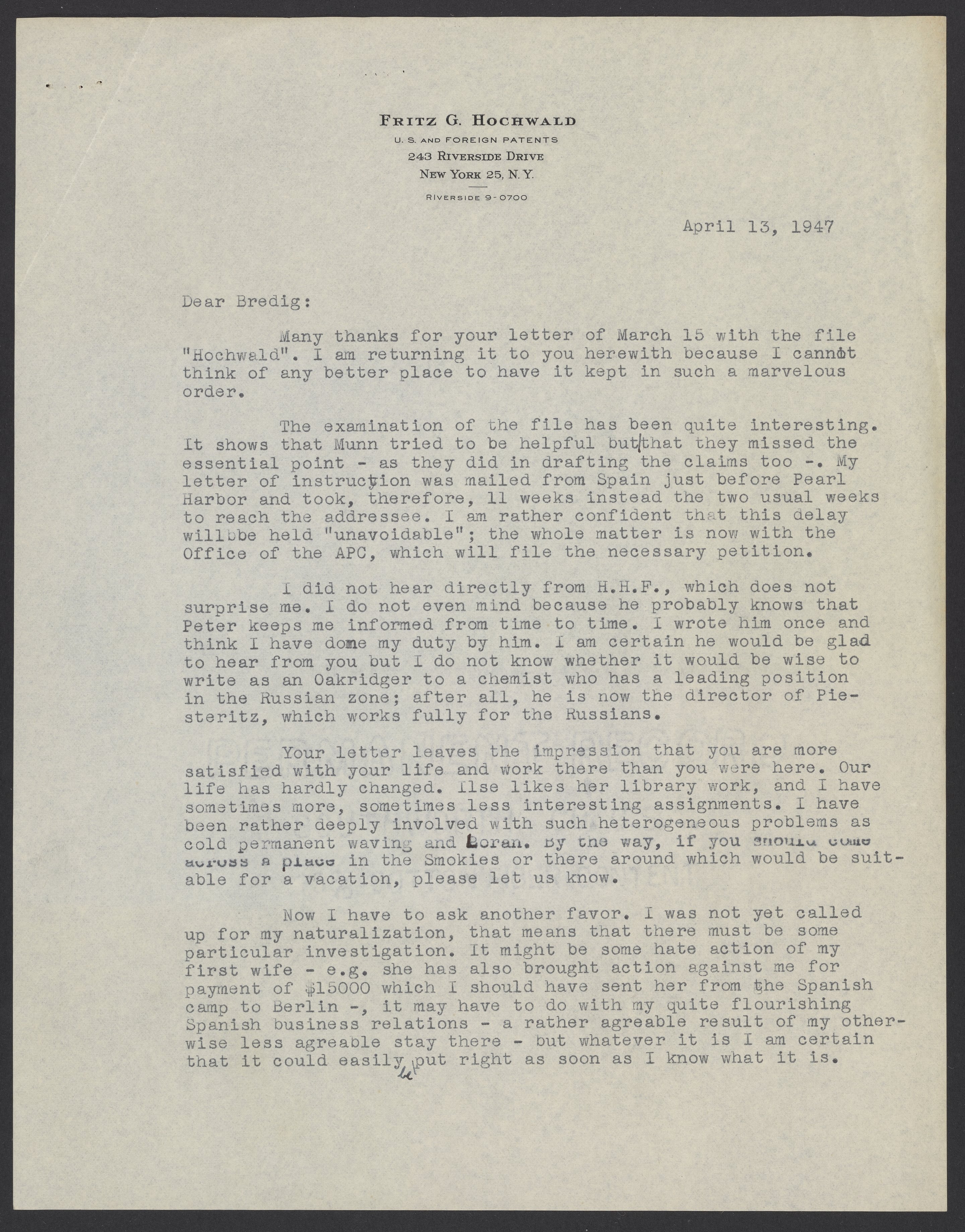 Letter from Fritz Hochwald to Max Bredig, April 13, 1947