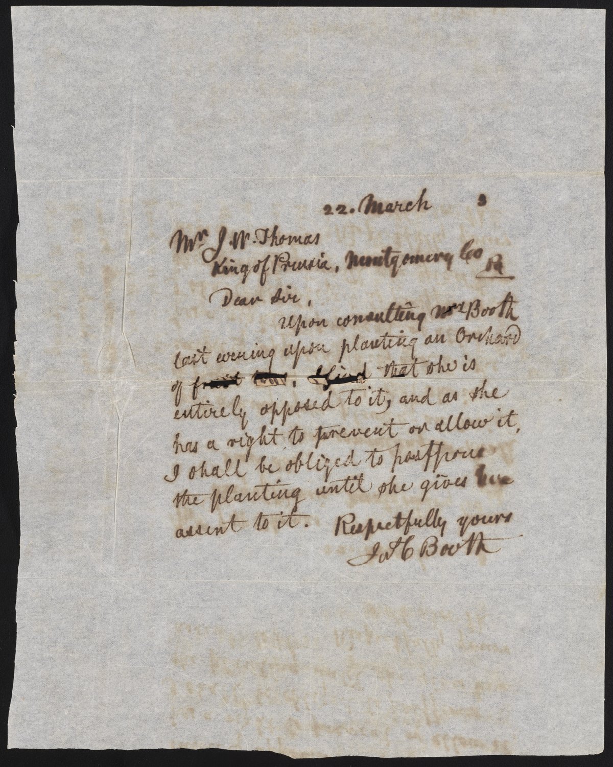 Small JPG1200 x 1501px — 360 KBLarge JPG2880 x 3603px — 2.0 MBFull-sized JPG5149 x 6441px — 5.4 MBOriginal fileTIFF — 5149 x 6441px — 94.9 MBJames Curtis Booth (1810-1888) reports that his wife, Margaret, is opposed to planting an orchard at this time.