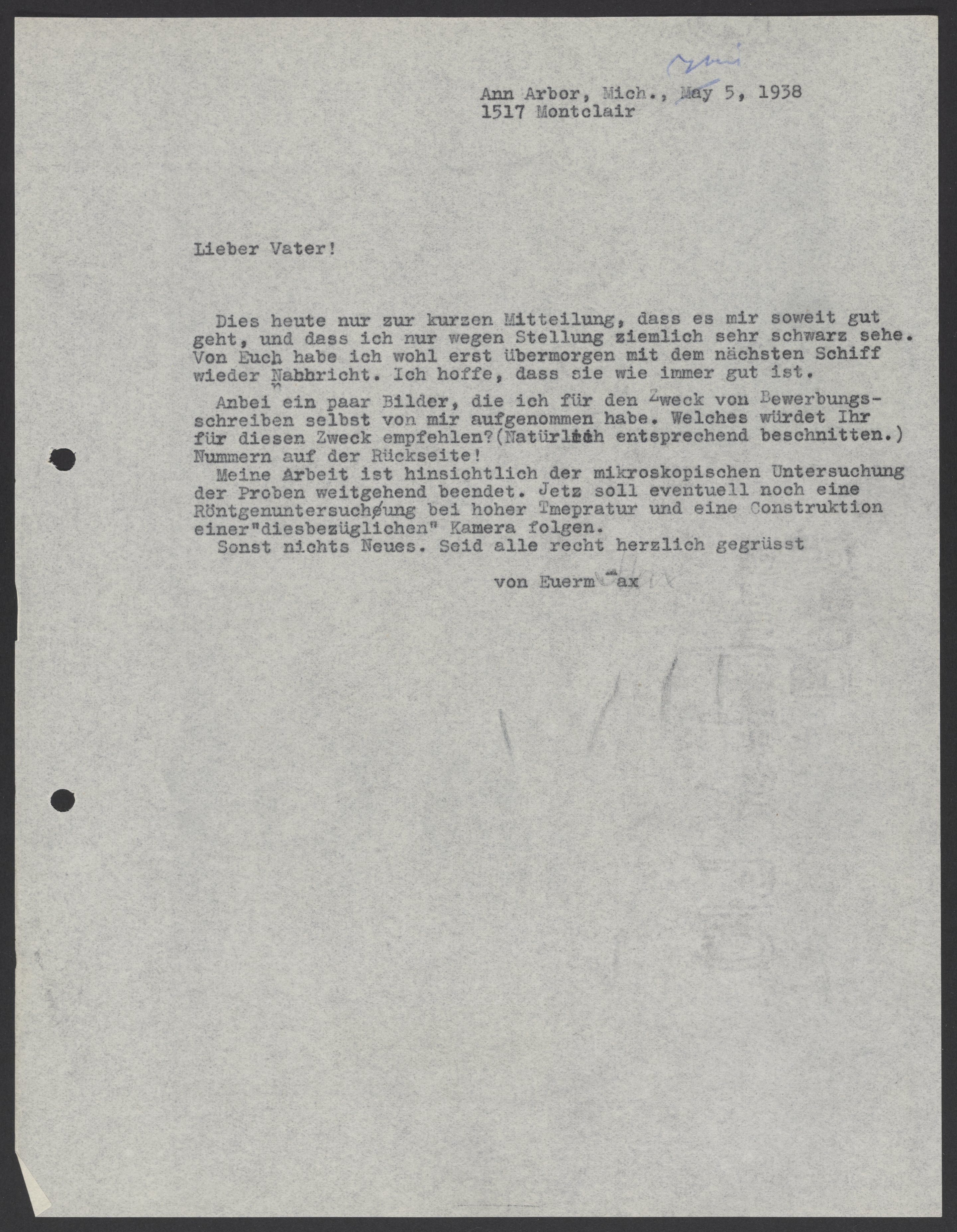 Max Albert Bredig (1902-1977) writes to his father, Georg Bredig (1868-1944) about his job search. He asks his father which photograph he thinks is best for applications.