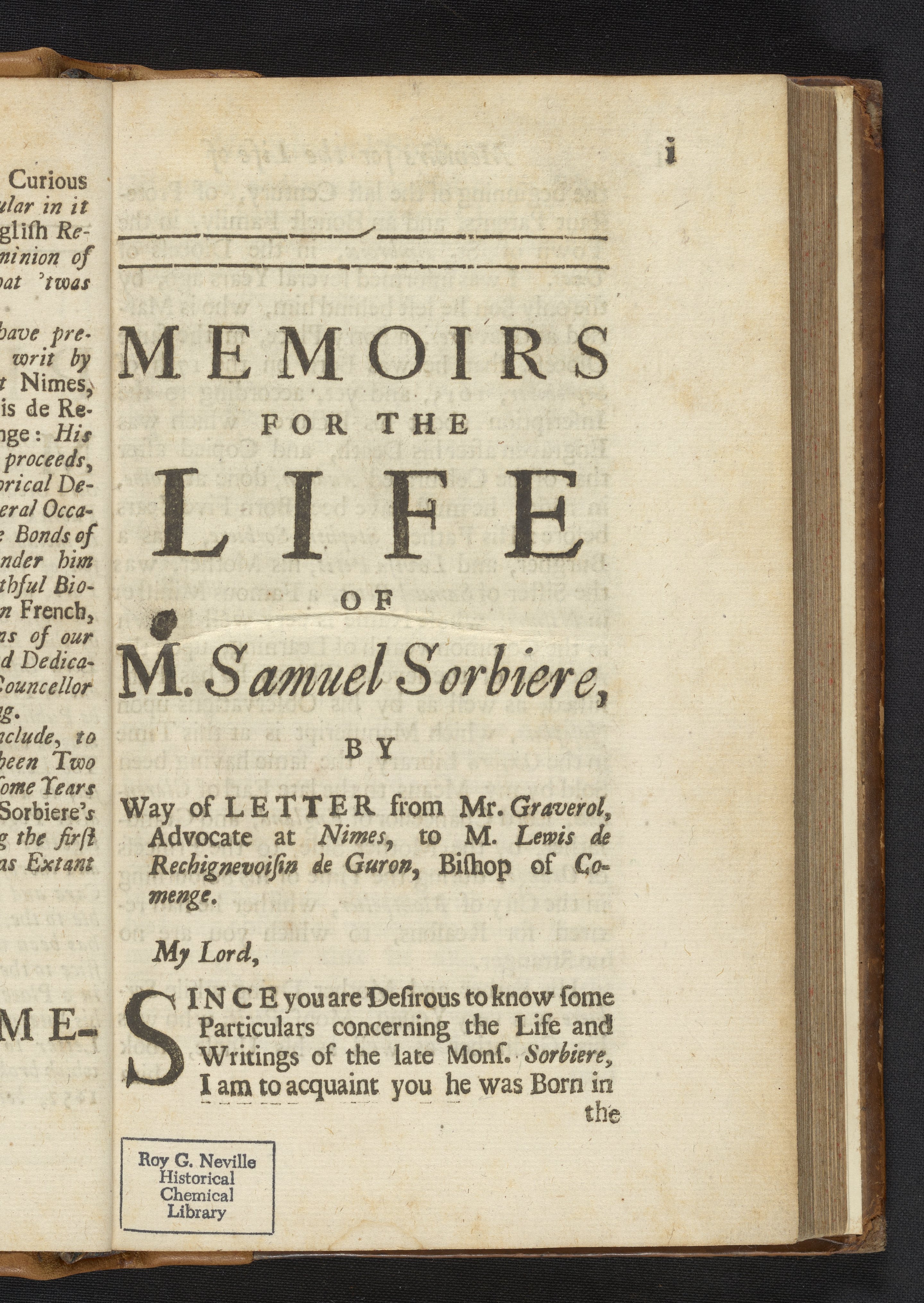 Sorbière, Samuel, M. Graverol, and Sprat, Thomas 1713. “Memoirs for the Life of M. Samuel Sorbiere.” In A Voyage to England: Containing Many Things Relating to the State of Learning, Religion, and Other Curiosities of That Kingdom. London, England: J. Woodard, 1709. https://digital.sciencehistory.org/works/duvek8l.