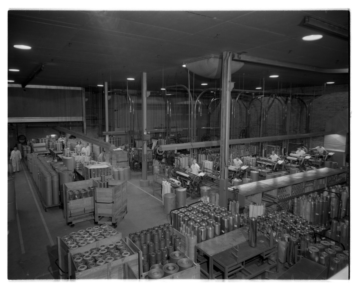 Elevated view of employees at work in the Dow Chemical Company's saran film manufacturing facilities in Midland, Michigan. During production, saran film was trimmed and wound into so-called inventory rolls, such as those visible throughout the facility. Initially developed for the U.S. Army to wrap arms and equipment for transport during World War II, saran plastic was subsequently developed and marketed as Saran Wrap for household use.