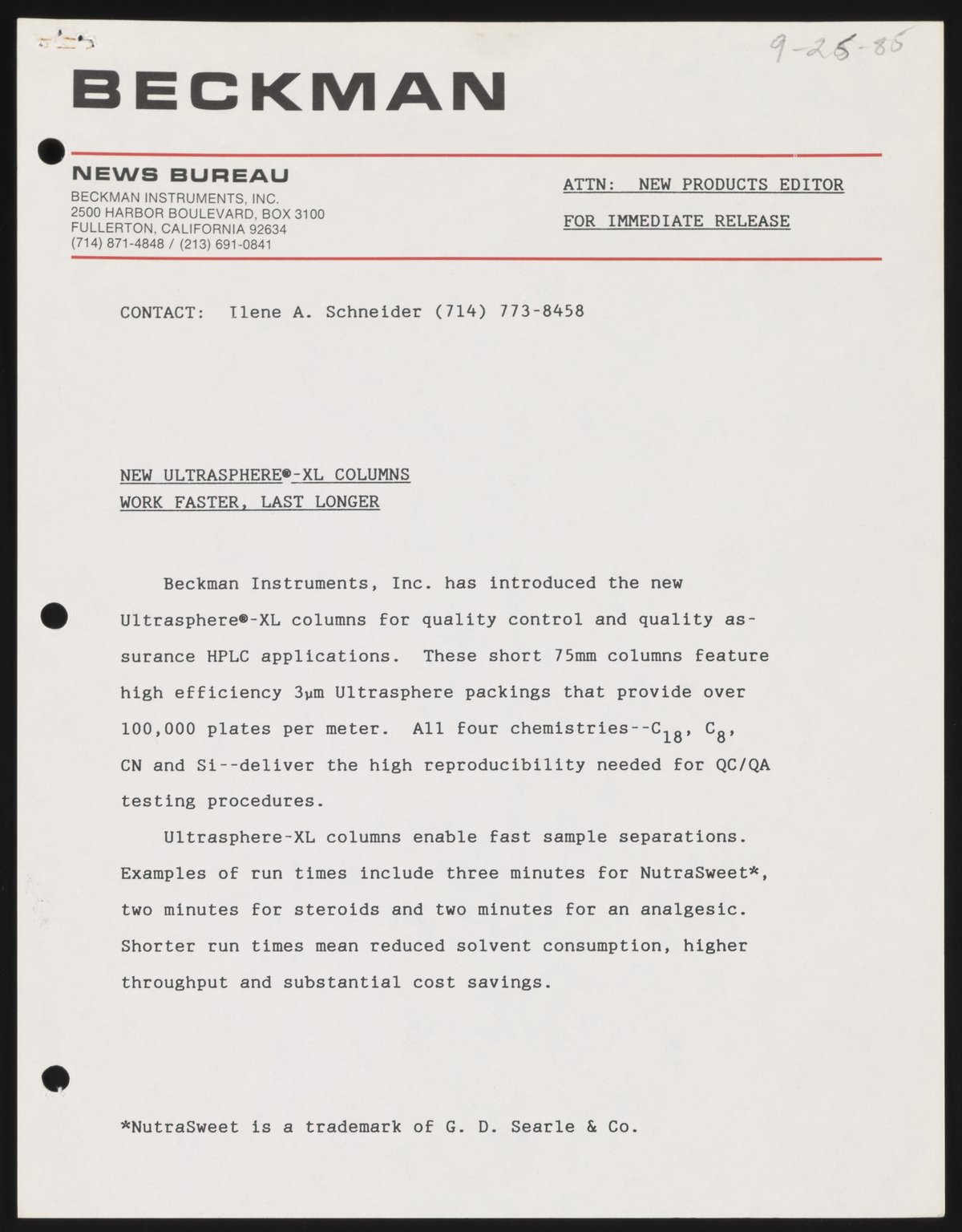 Schneider, Ilene. “New Ultrasphere-XL Columns Work Faster, Last Longer,” September 25, 1985. Beckman Historical Collection, Box 58, Folder 70. Science History Institute. Philadelphia. https://digital.sciencehistory.org/works/dv13zt93f.