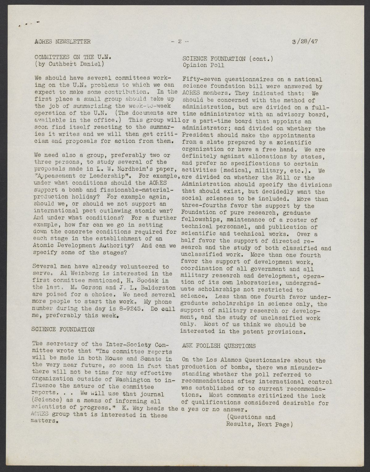 Newsletter for the Association of Oak Ridge Engineers and Scientists (AORES), March 28, 1947