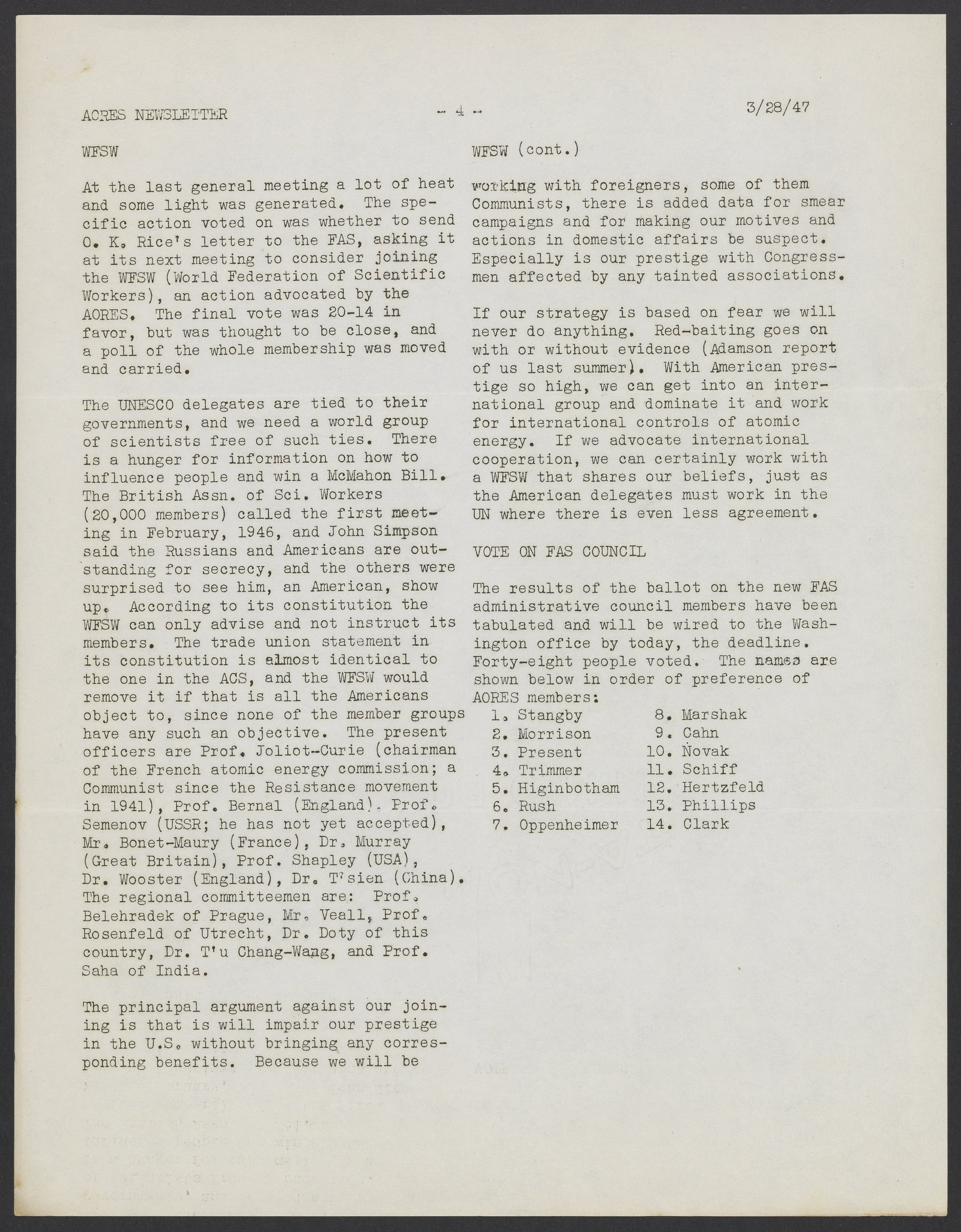 Newsletter for the Association of Oak Ridge Engineers and Scientists (AORES), March 28, 1947