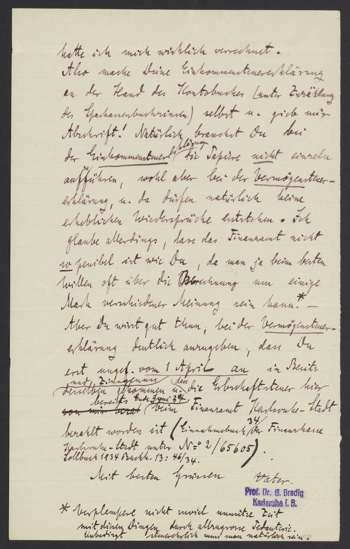 Aber Du wirst gut thun, bei der Vermögensteuererklärung deutlich anzugeben, dass Du erst ungef. vom 1. April an in Besitz desselben und Zinsgenuss u. dass die Erbschaftsteuer hier bereits Ende Juni 34 beim Finanzamt Karlsruhe-Stadt bezahlt worden ist (Einnahmebuch 34 / der Finanzkasse Karlsruhe-Stadt unter No 2/65605 Zollbuch 1934 Buch. 13: 46/34)
