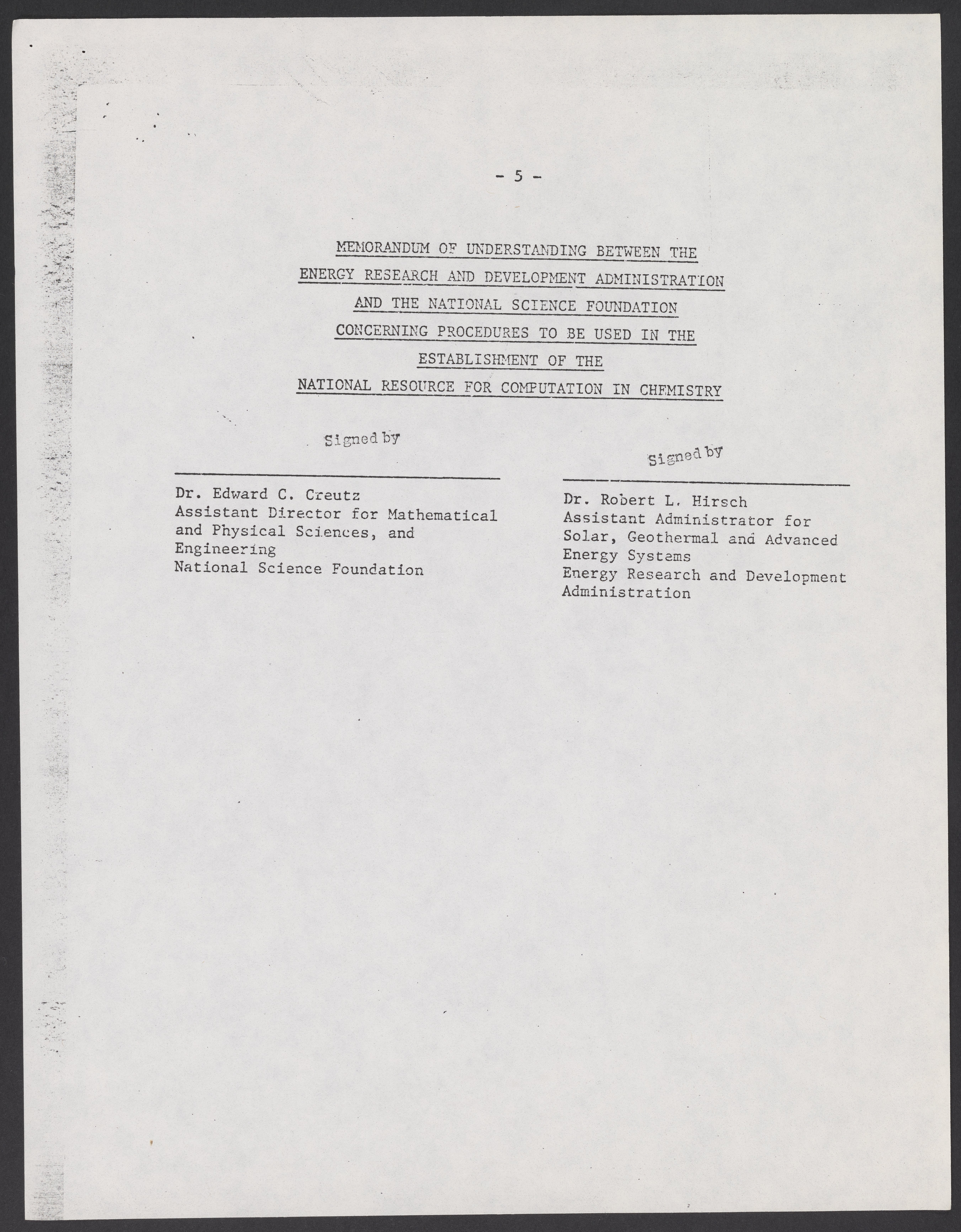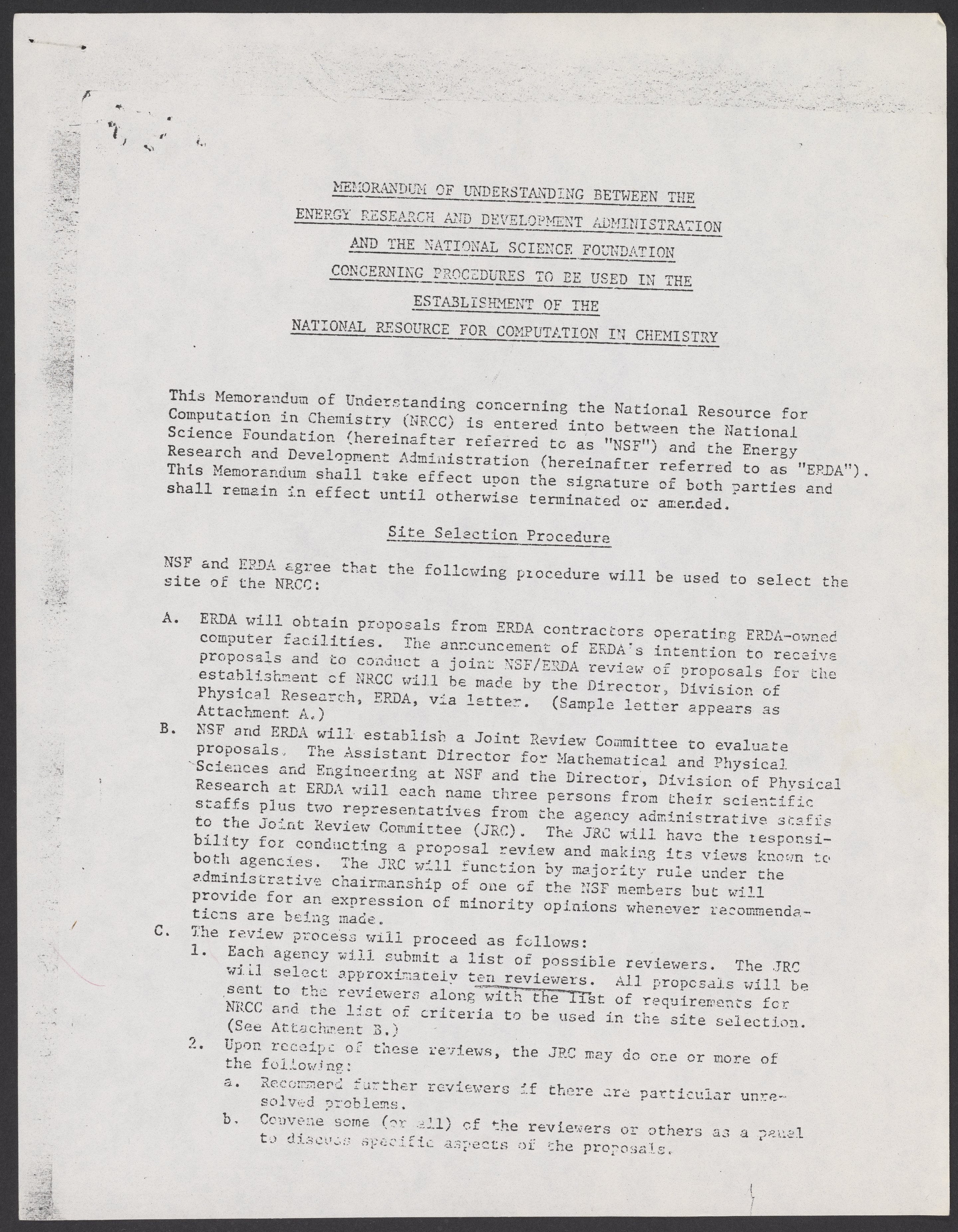 National Science Foundation (U.S.), United States. Energy Research and Development Administration, and Lawrence Berkeley Laboratory. National Resource for Computation in Chemistry. “Memorandum of Understanding Between the Energy Research and Development Administration and the National Science Foundation Concerning Procedures to Be Used in the Establishment of the National Resource for Computation in Chemistry.,” 1976. William A. Lester, Jr. Papers, Box 3, Folder 12. Science History Institute. Philadelphia. https://digital.sciencehistory.org/works/dxryh4i.