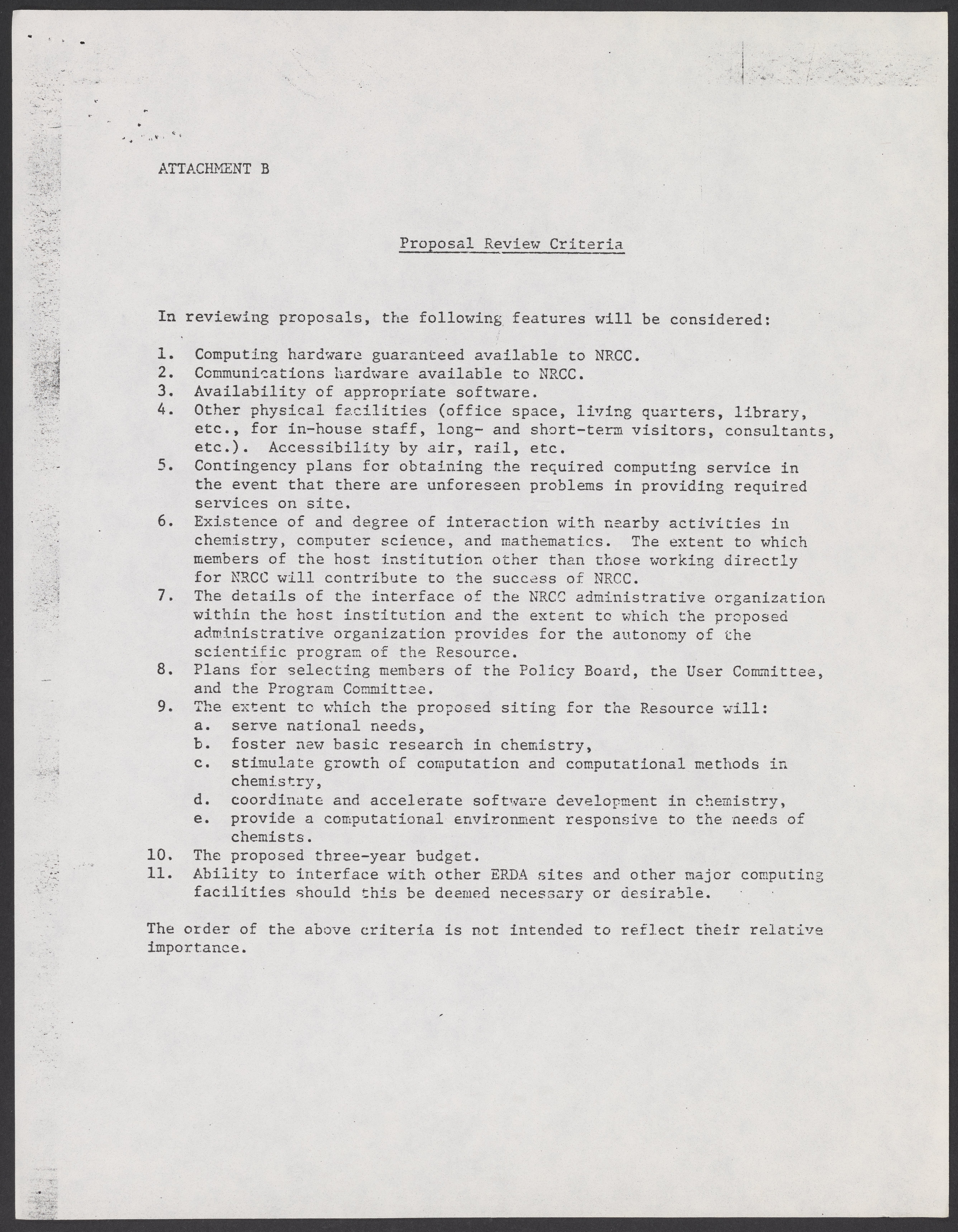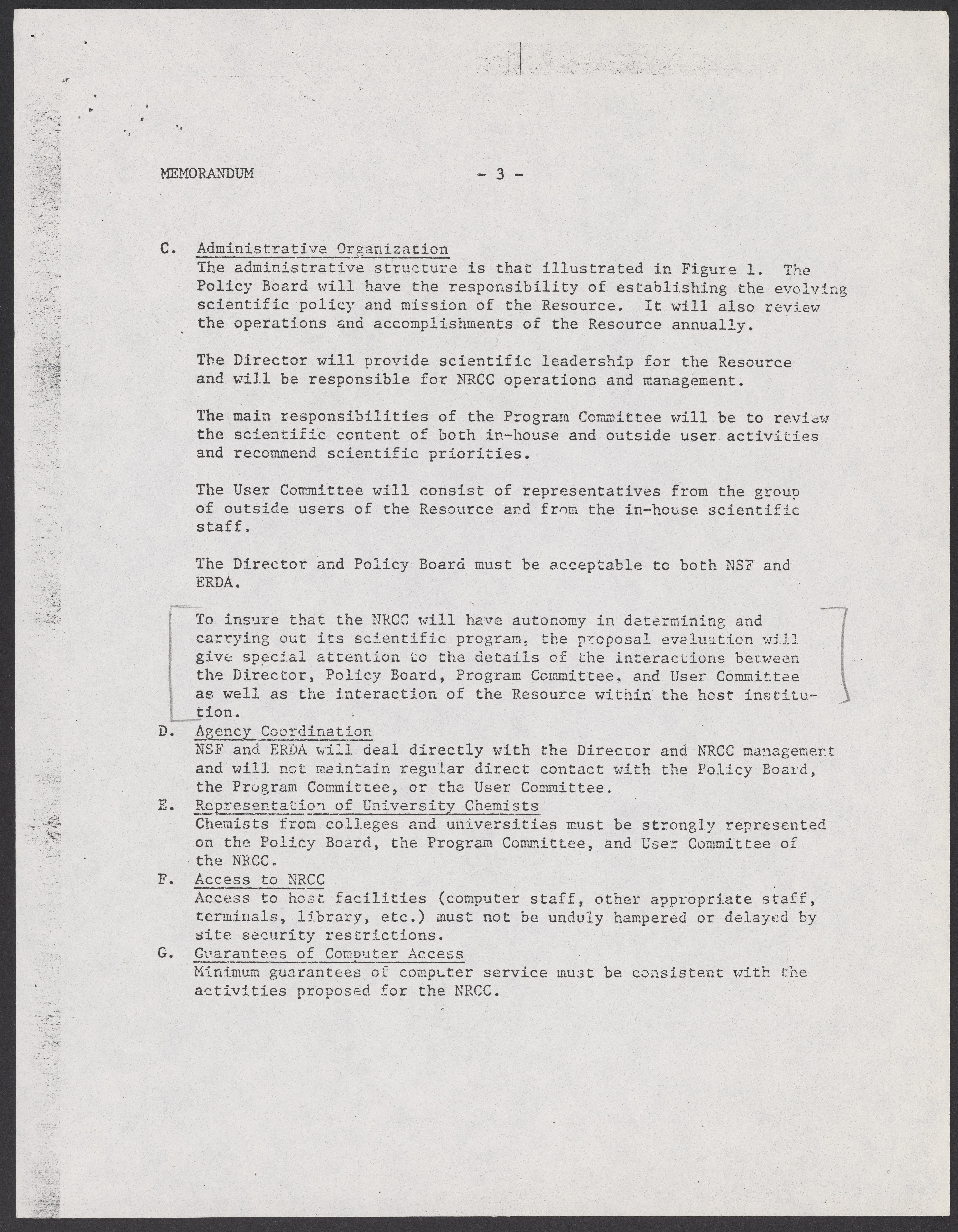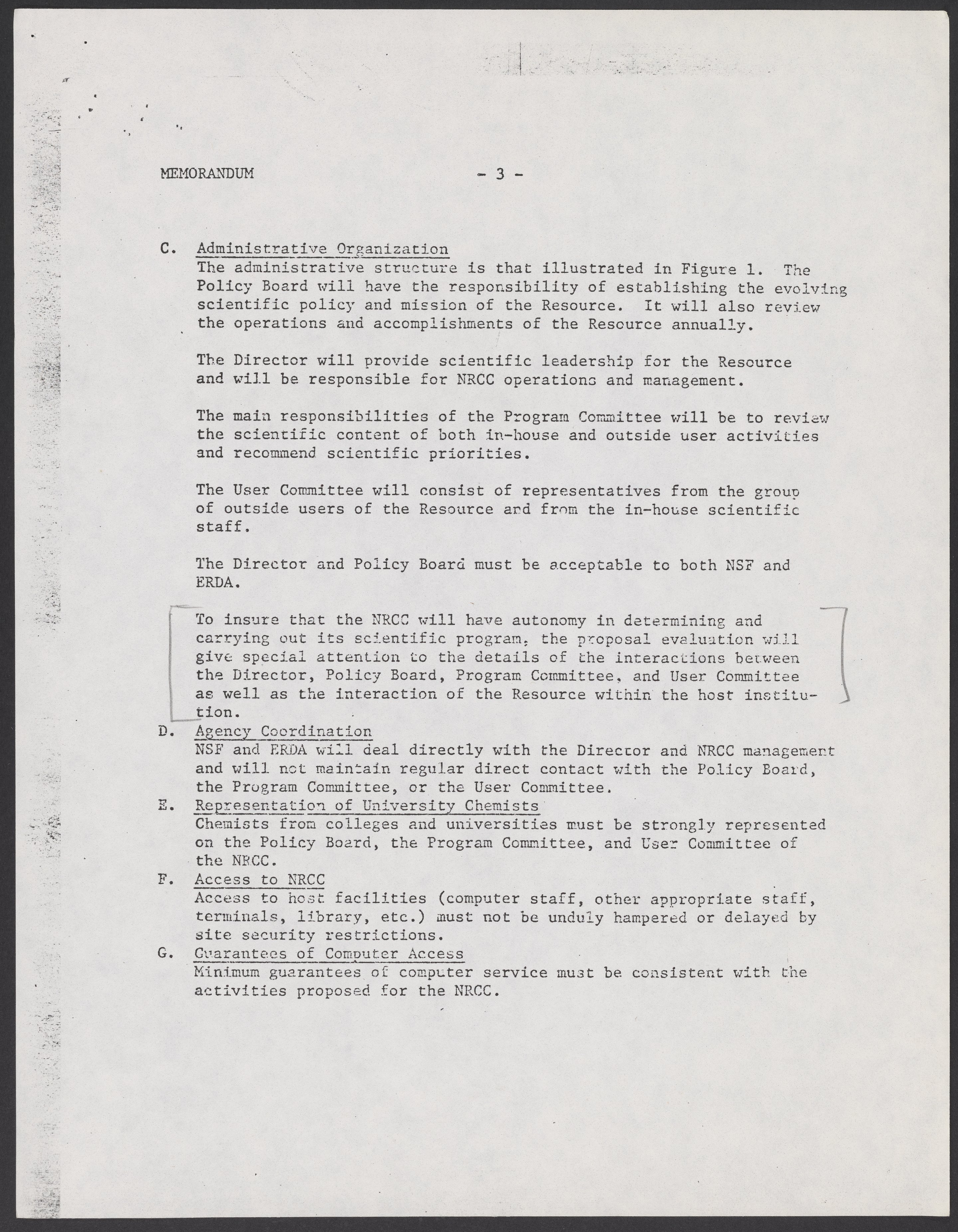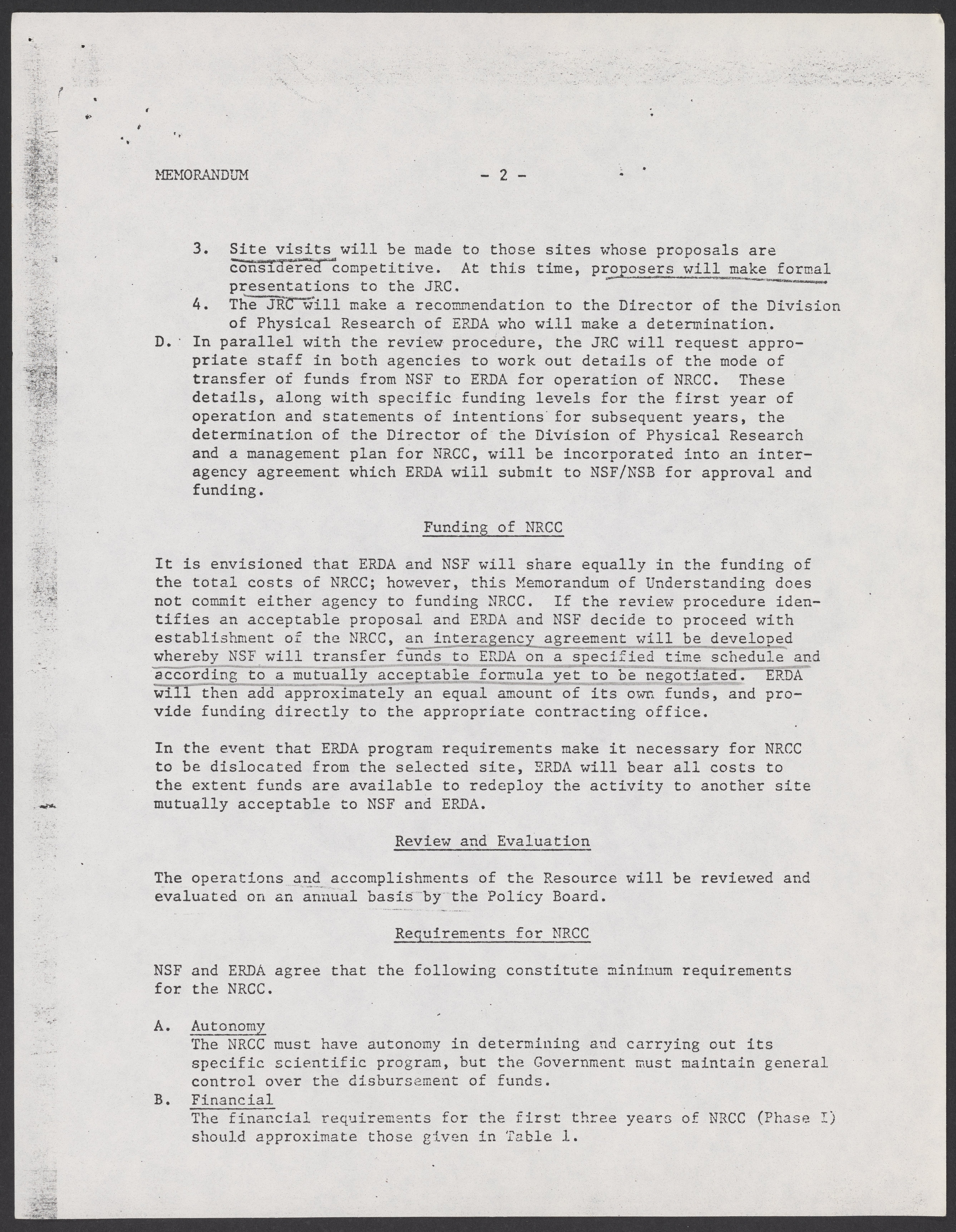 Small JPG1200 x 1542px — 336 KBLarge JPG2880 x 3702px — 1.9 MBFull-sized JPG5363 x 6893px — 6.2 MBOriginal fileTIFF — 5363 x 6893px — 106 MBMemorandum regarding the establishment of the National Resource for Computation in Chemistry (NRCC) between the two entities, the National Science Foundation (NSF) and the Energy Research and Development Administration (ERDA). The document outlines the site selection procedures, funding, organizational requirements, budget, and includes a letter written by James S. Kane of ERDA.
