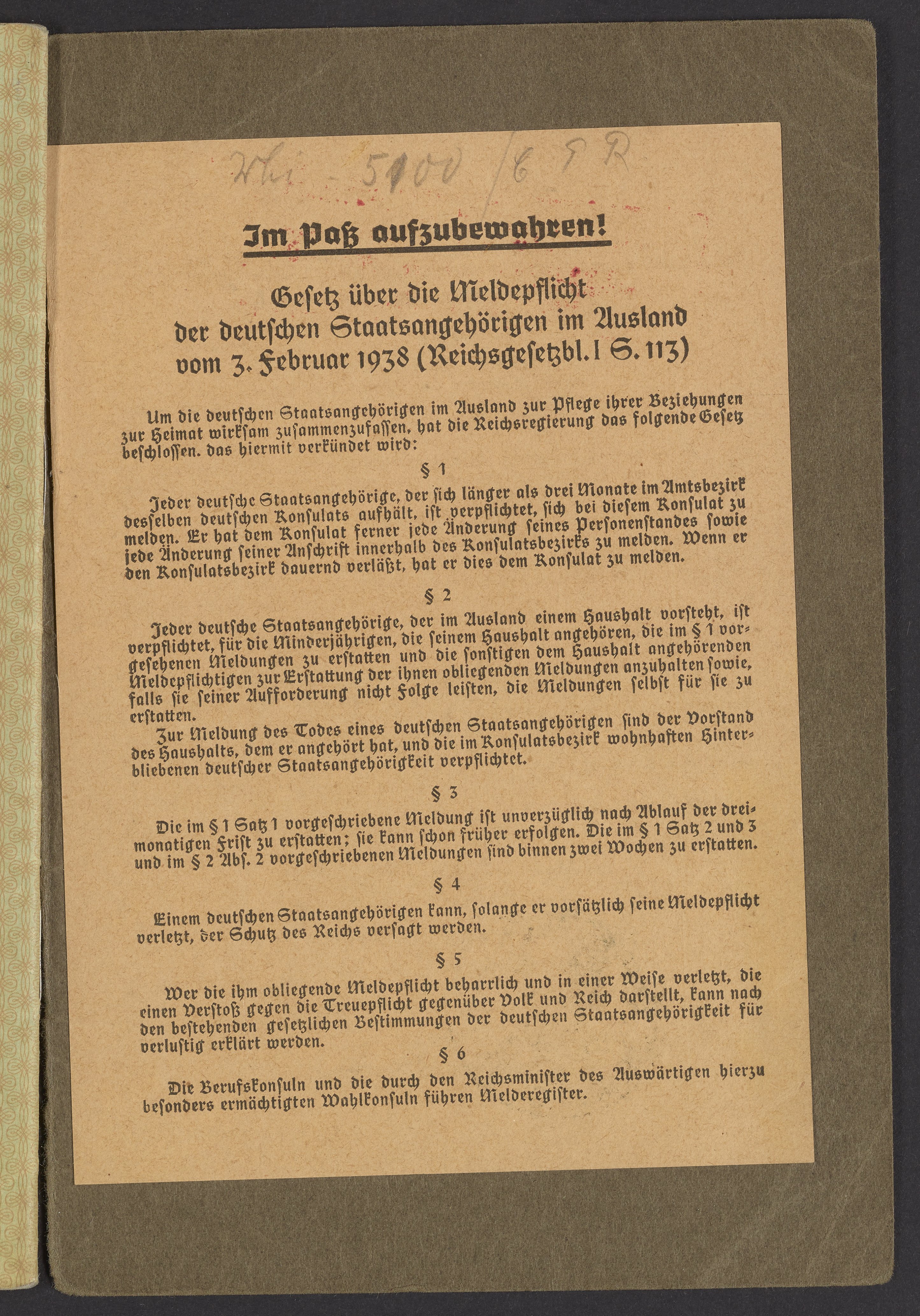 Small JPG1200 x 1708px — 442 KBLarge JPG2880 x 4098px — 2.5 MBFull-sized JPG2894 x 4118px — 2.6 MBOriginal fileTIFF — 2894 x 4118px — 34.2 MBMax Mislow's (1887-1963) German Reich passport, issued on December 29, 1938 by the General Consulate of Germany in Milan, Italy. Max Mislow was the father of Kurt M. Mislow (1923-2017).