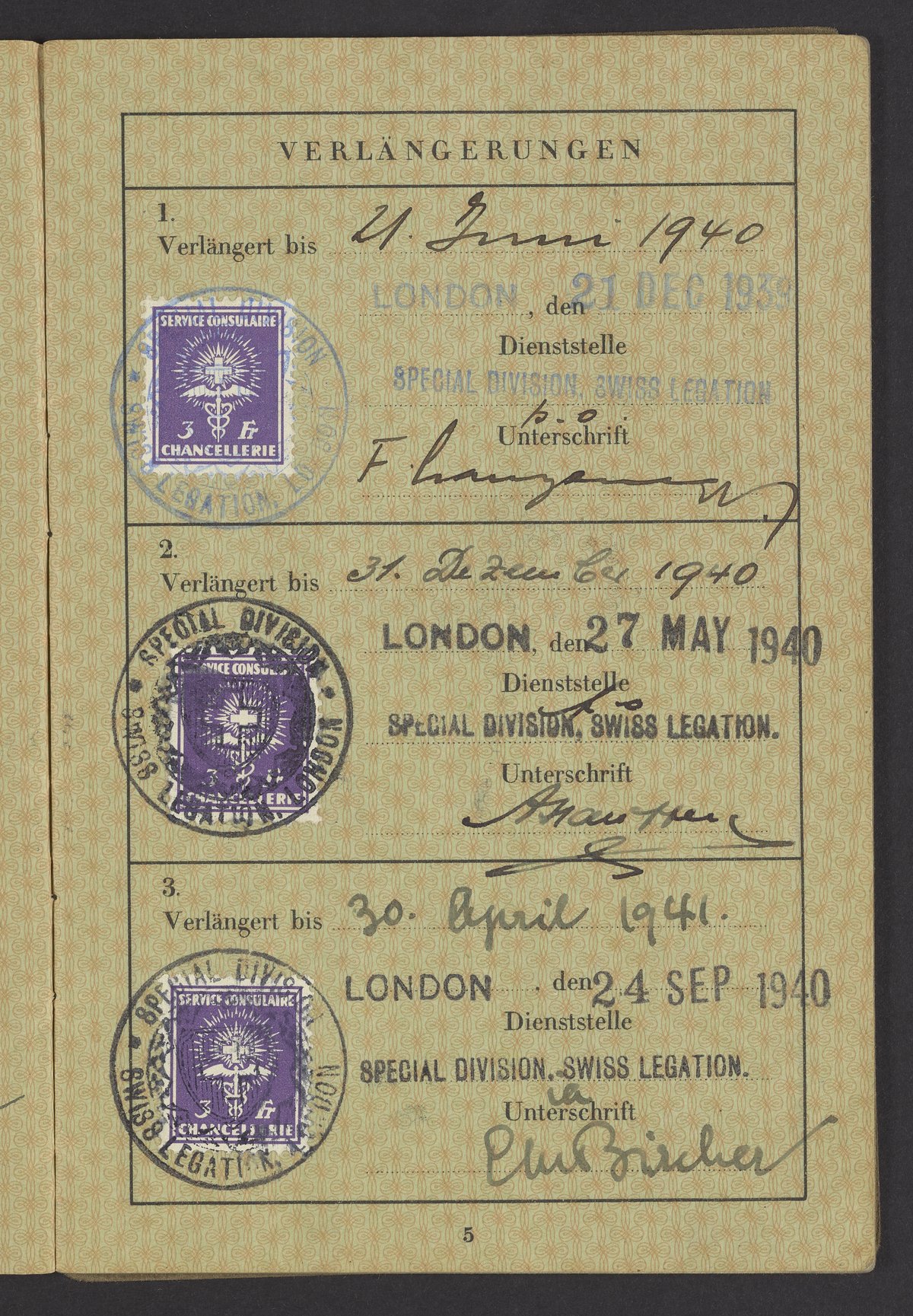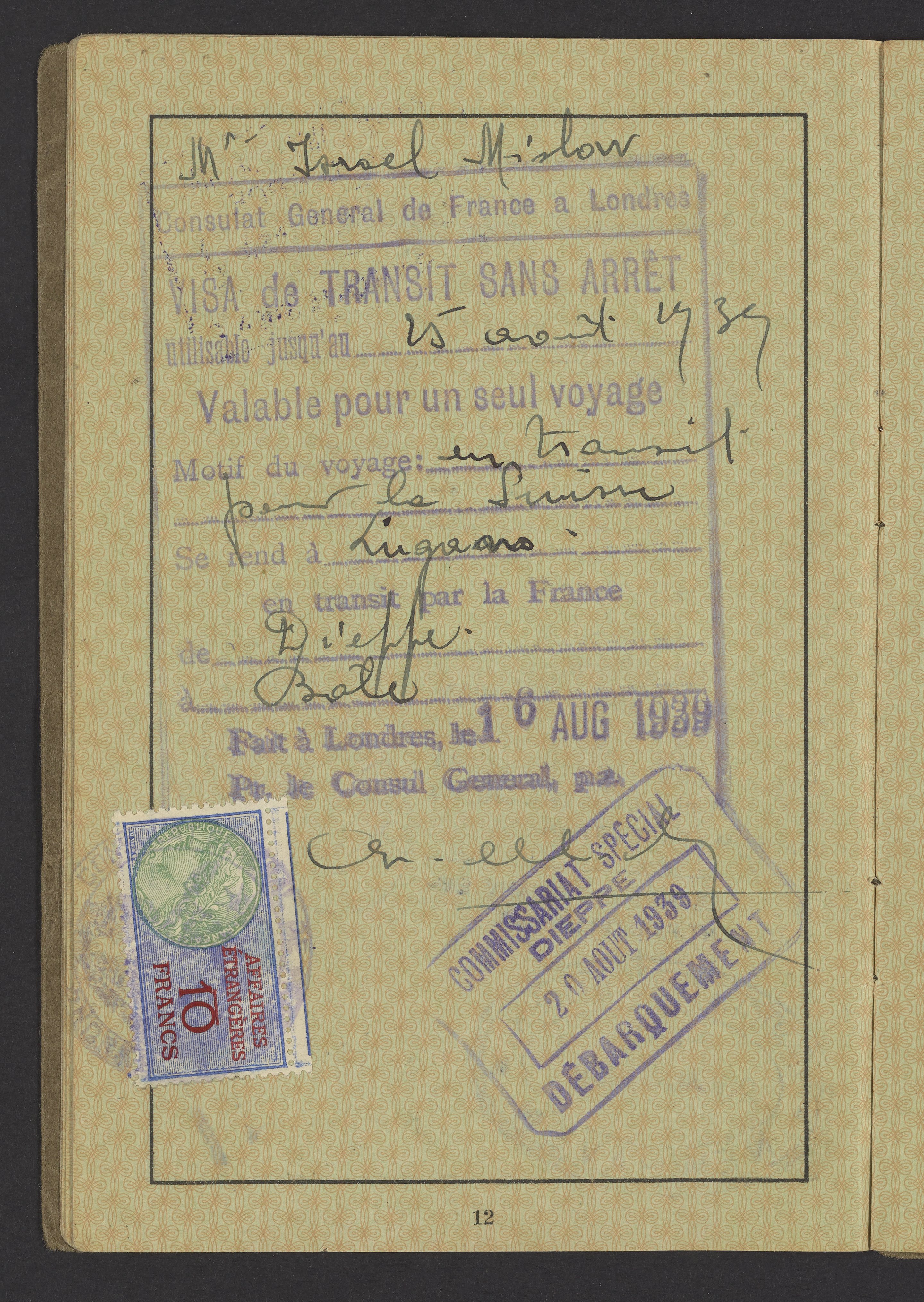 At this time in Germany, Jewish Germans and stateless Jews were allowed to use only Hebrew first names and family names issued by the Reich Minister of the Interior. If they didn't choose a new Hebrew name, men were assigned the name Israel and women, Sarah. Failure to take these names was punishable by imprisonment. The first page of the passport lists Max's name as "Israel Max Mislow," possibly because of the forcible assignment of Jewish names.