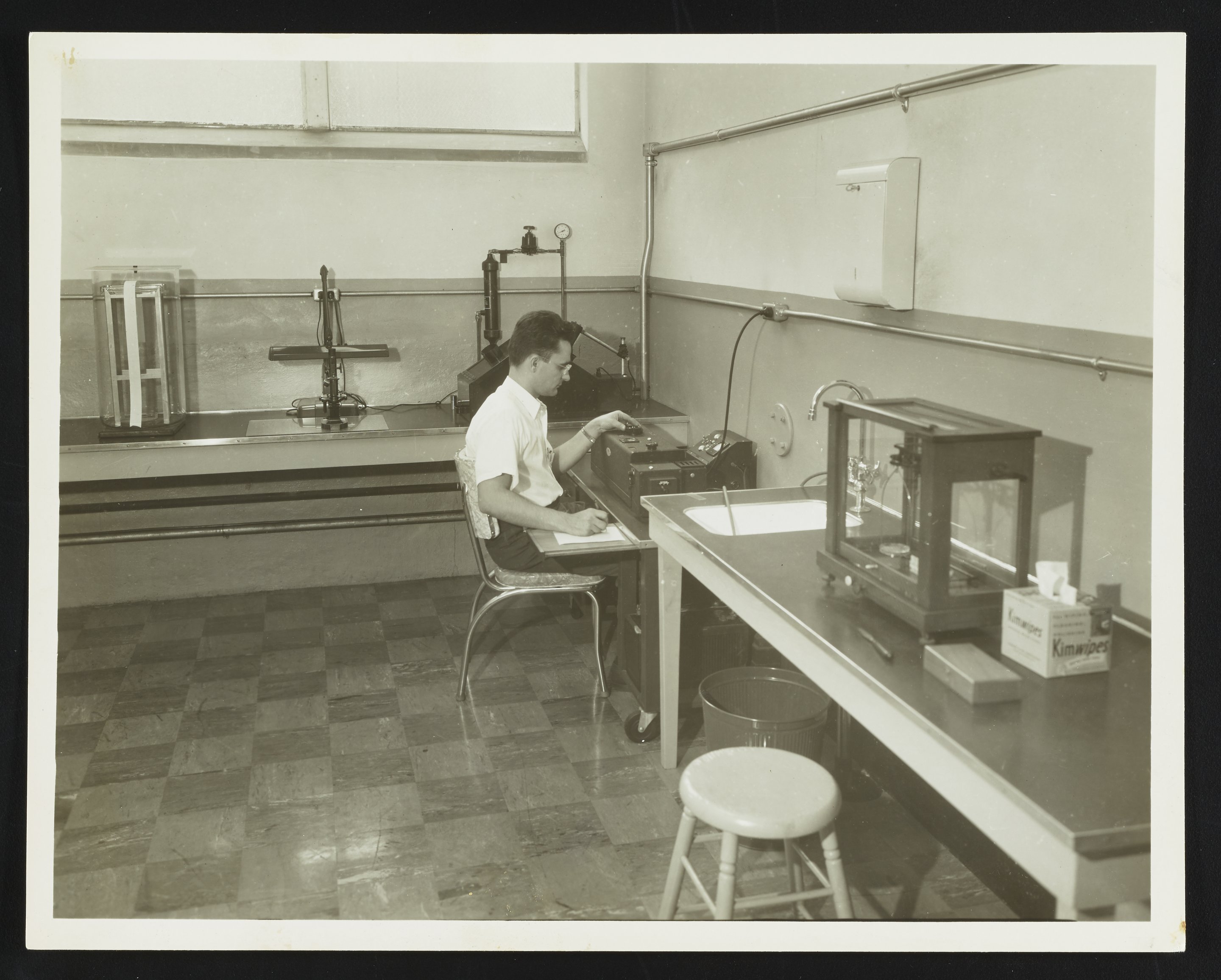 View of chemist James Feeman using a Beckman Model DU (Ultraviolet/Visible) Spectrophotometer in the Research Laboratory at the Althouse Chemical Company plant in Reading, Pennsylvania. Other laboratory apparatus visible in the photograph include (from left to right) a paper chromatography jar, a microscope and lamp, an ultraviolet light box, and an Analytical Balance No. 35 made by Henry Troemner.