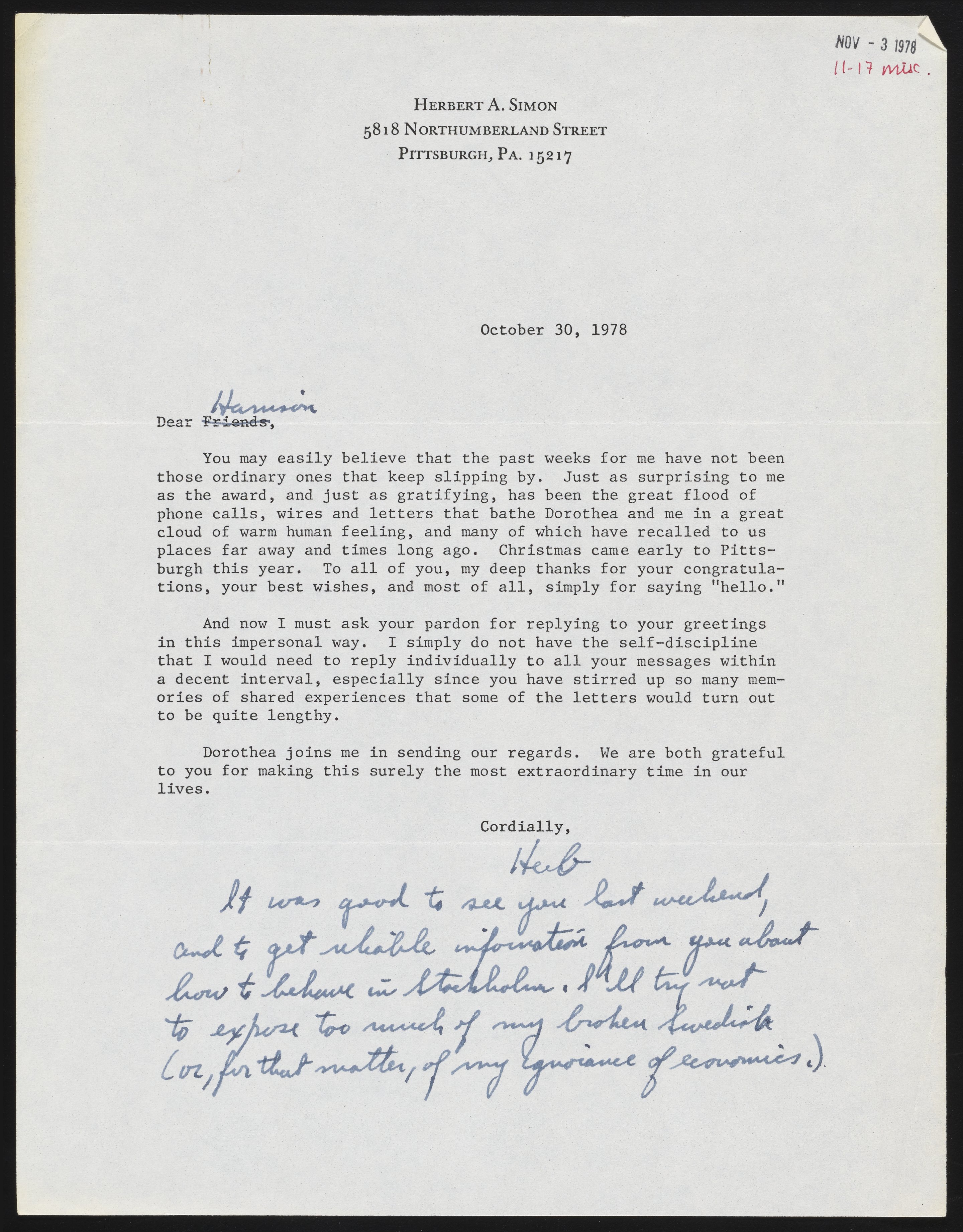 Letter from Herbert A. Simon to Harrison Shull
