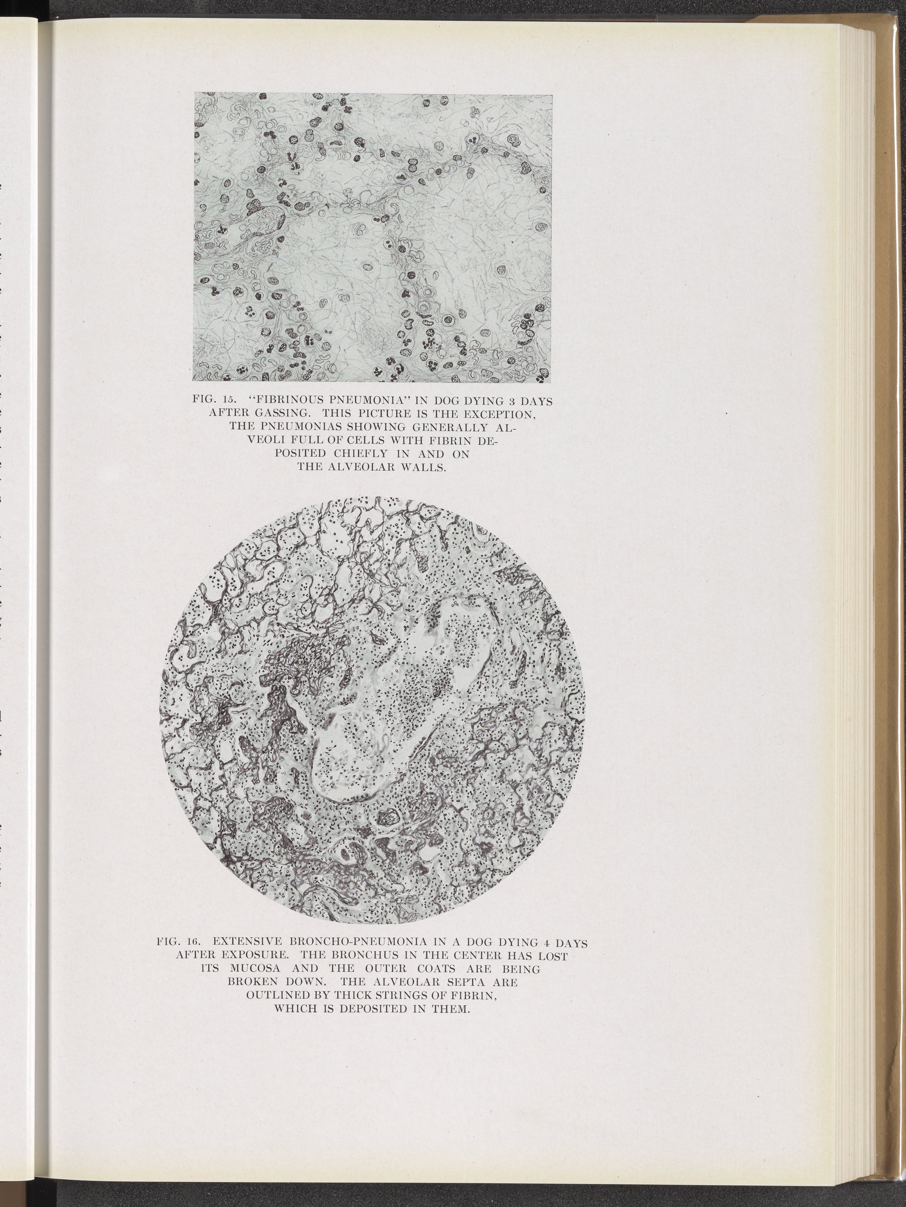 Fig. 15: "Fibrinous pneumonia" in dog dying 3 days after gassing. Fig. 16: Extensive broncho-pneumonia in a dog dying 4 days after exposure.