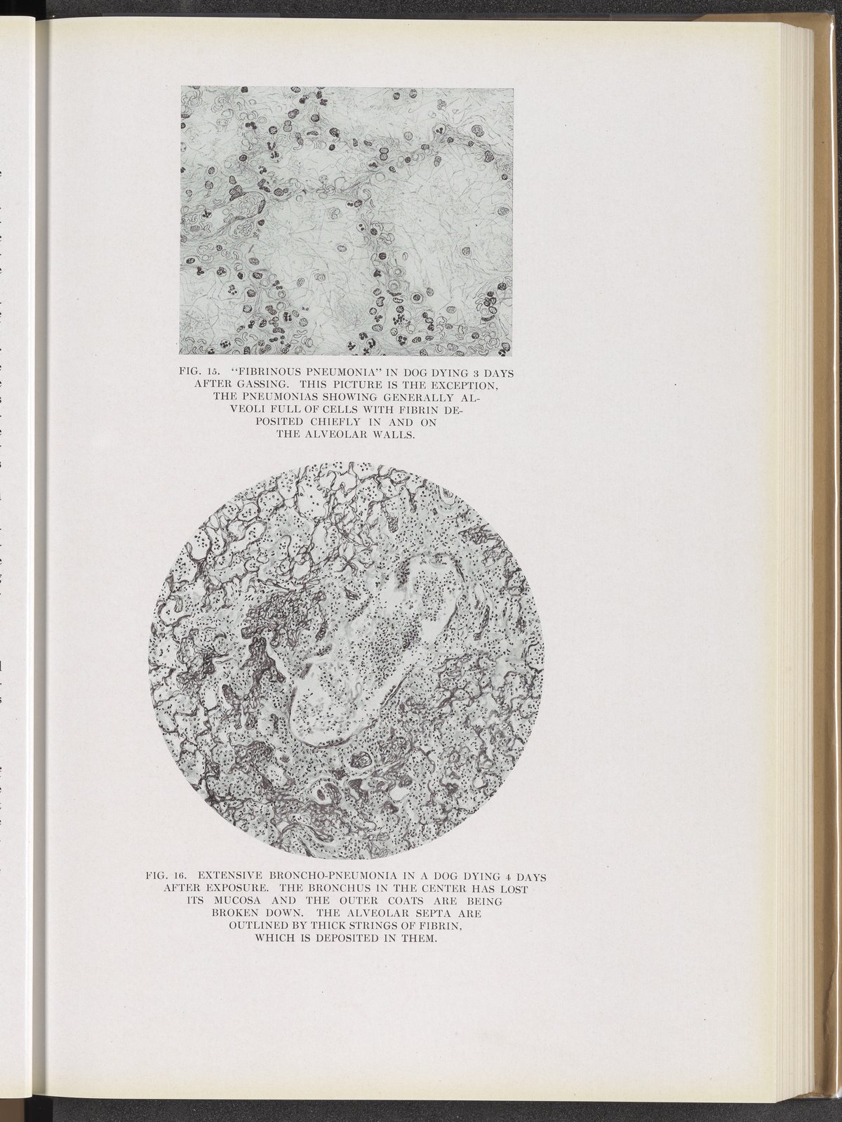 Winternitz, M. C. (Milton C.). “Fig. 15: ‘Fibrinous Pneumonia’ in Dog Dying 3 Days after Gassing. Fig. 16: Extensive Broncho-Pneumonia in a Dog Dying 4 Days after Exposure.” Collected Studies on the Pathology of War Gas Poisoning. New Haven, Connecticut: Yale University Press, 1920. https://digital.sciencehistory.org/works/dz010q26z.