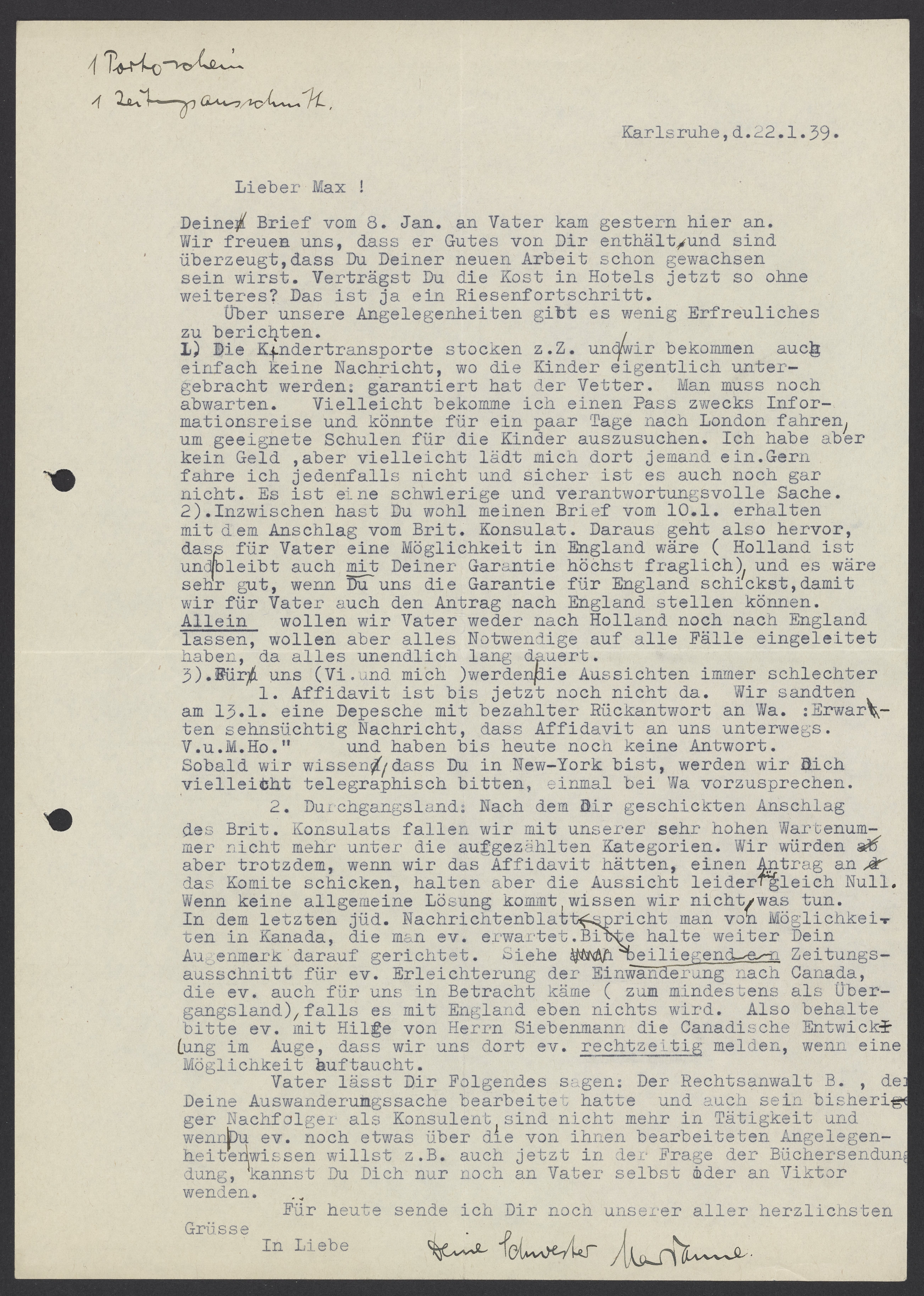2. Durchgangsland: Nach dem an Dir geschickten Anschlag des. Brit. Konsulats fallen wir mit unserer sehr hohen Wartenummer nicht mehr unter die aufgezählten Kategorien. Wir würden aber trotzdem, wenn wir das Affidavit hätten, einen Antrag an das Komitee schicken, halten aber die Aussicht leider gleich Null. Wenn keine allgemeine Lösung kommt, wissen wir nicht, was tun. In dem letzten jüd. Nachrichtenblatt spricht man von Möglichkeiten in Kanada, die man ev. erwartet. Bitte halte weiter Dein Augenmerk darauf gerichtet. Siehe beiliegende Zeitungsausschnitt für ev. Erleichterung der Einwanderung nach Canada, die ev. auch für uns in Betracht käme (zum mindestens als Übergangsland), falls es mit England eben nichts wird. Also behalte bitte ev. mit Hilfe von Herrn Siebenmann die Canadische Entwicklung im Auge, dass wir uns dort ev. rechtzeitig melden, wenn eine Möglichkeit auftaucht.