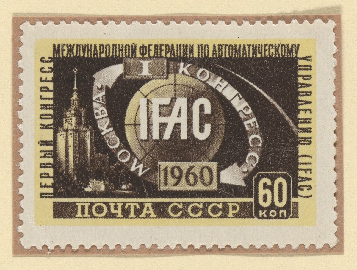 Soviet Union postage stamp commemorating the First Congress of the International Federation of Automatic Control (IFAC), which first took place in Moscow, Russia. The stamp features the Tower of the University of Moscow and the emblem of the Congress.
