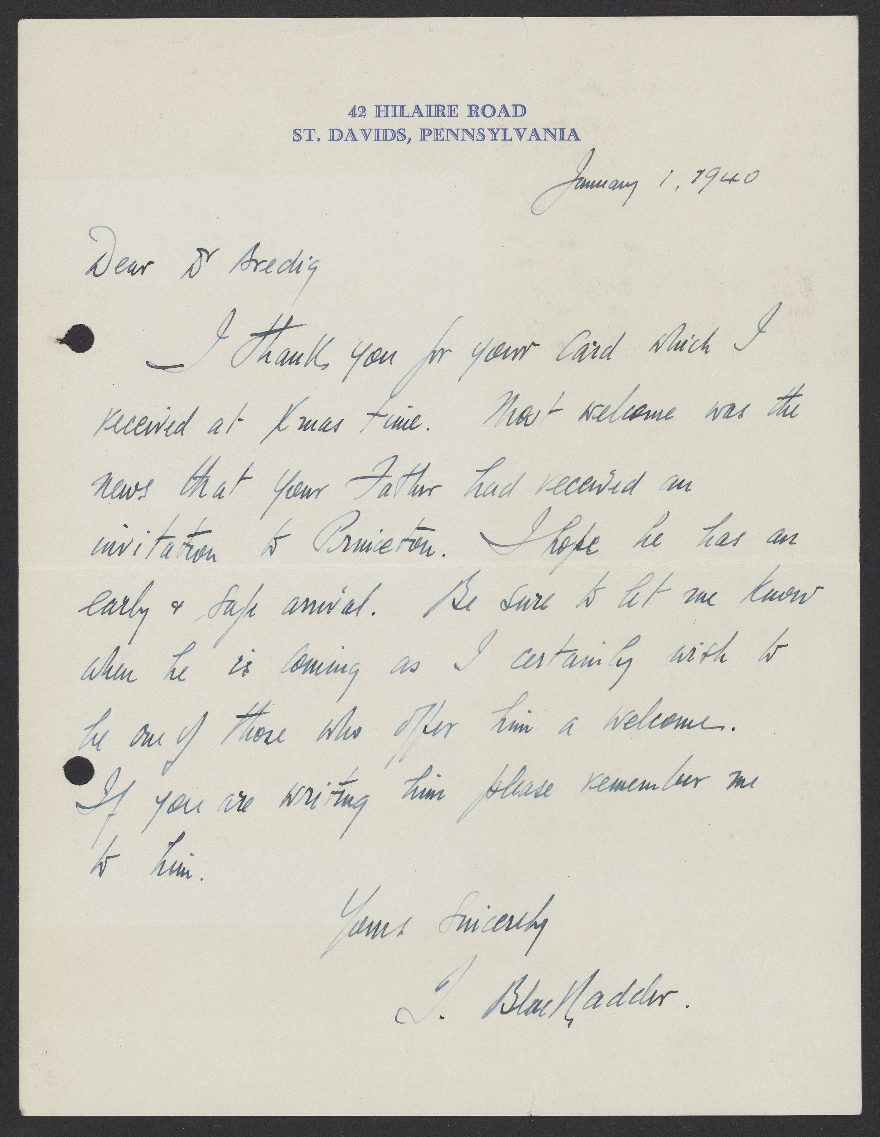 Letter from Thomas Blackadder to Max Bredig, January 1940