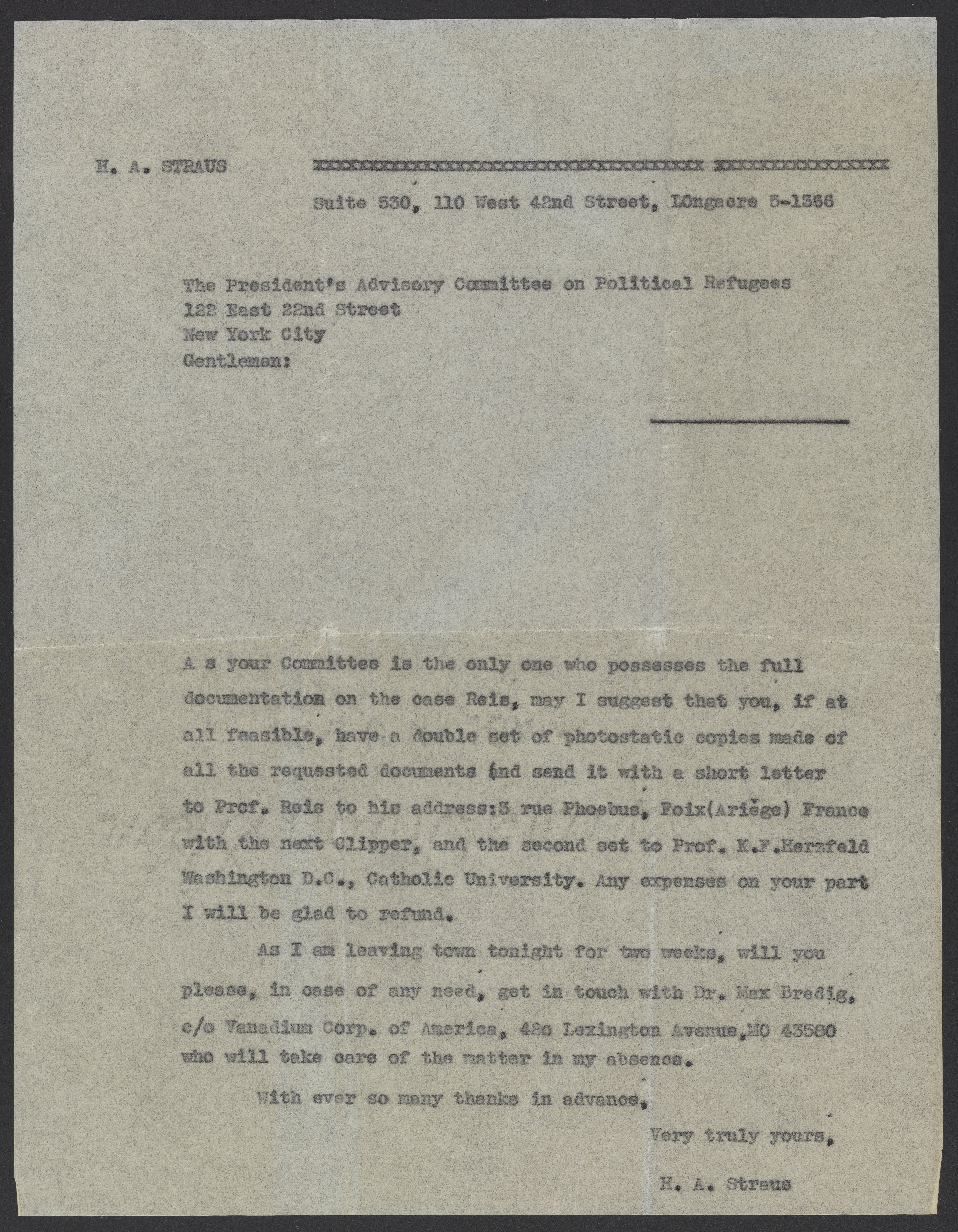 In an effort to secure the immigration of Dr. Alfred Reis (1882-1951), Hans A. Straus writes to suggest copies of Reis's immigration paperwork be sent to both Reis' French addres as well as to Professor K. F. Herzfeld of Catholic University in Washington D.C.