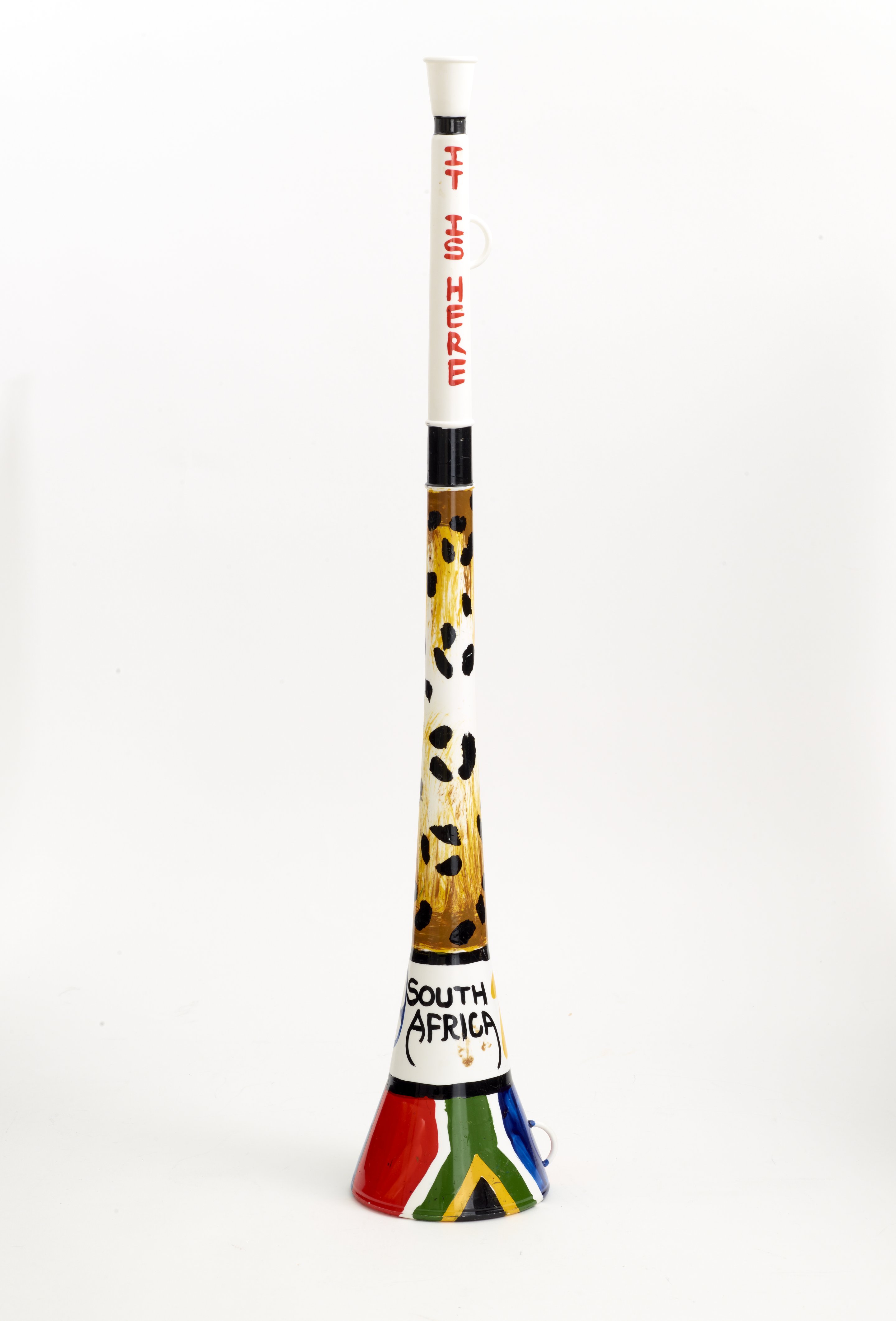 Small JPG1200 x 762px — 55.0 KBLarge JPG2880 x 1829px — 166 KBFull-sized JPG9214 x 5852px — 1.6 MBOriginal fileTIFF — 9214 x 5852px — 154 MBWhite plastic horn-shaped noise maker used by cheering fans at the 2010 Fifa World Cup held in South Africa. The vuvuzela is handpainted in multiple colors with acrylic paint. The horn's bell is decorated with the South African flag and the body is decorated with animal print.