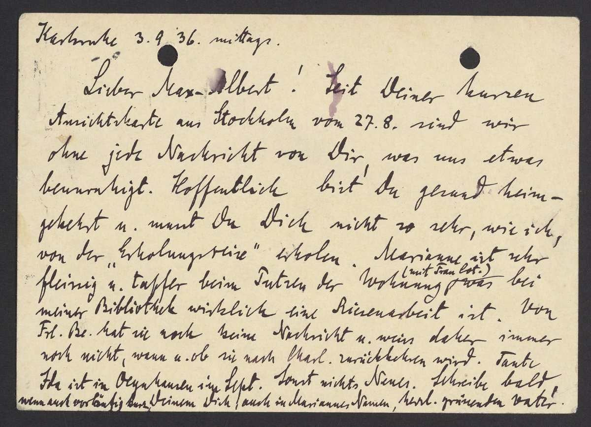 Postcard from Georg Bredig to Max Bredig, September 3, 1936
