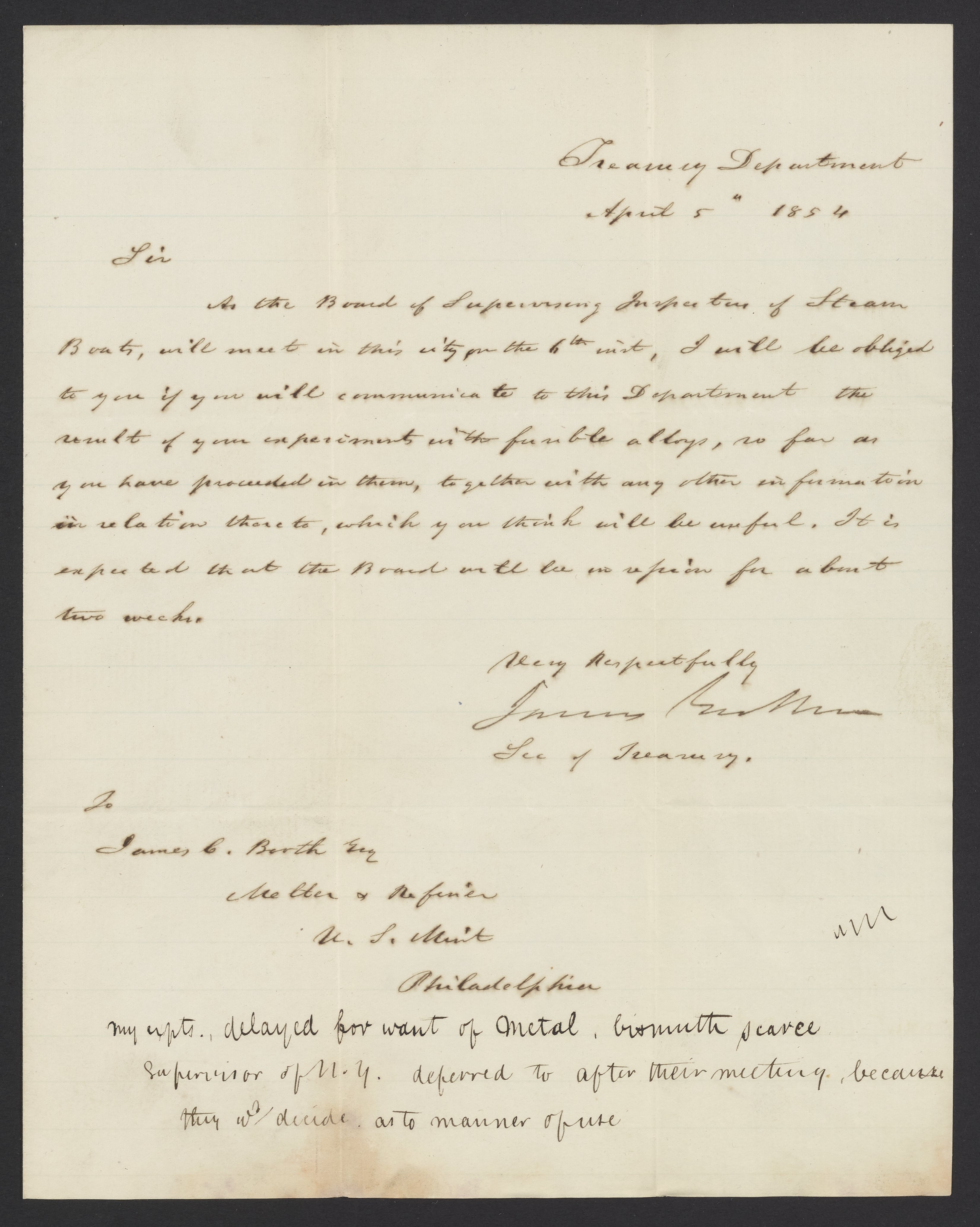 Small JPG1200 x 1502px — 183 KBLarge JPG2880 x 3604px — 970 KBFull-sized JPG3309 x 4141px — 1.2 MBOriginal fileTIFF — 3309 x 4141px — 39.3 MBJames B. Guthrie (1792 - 1869), United States Secretary of the Treasury from 1853-1857, requests James Curtis Booth (1810-1888) testify before the New York Board of Supervisory Inspectors of Steam Boats. Booth notes that he is unable to do so due to a scarcity of bismuth which had delayed his research.