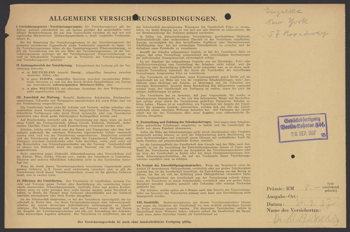 Europäische güter und reisegepäck-versicherungs-aktiengesellschaft. “Reisegepäck-Versicherung,” September 30, 1937. Papers of Georg and Max Bredig, Box 10, Folder 17. Science History Institute. Philadelphia. https://digital.sciencehistory.org/works/ei3coei.