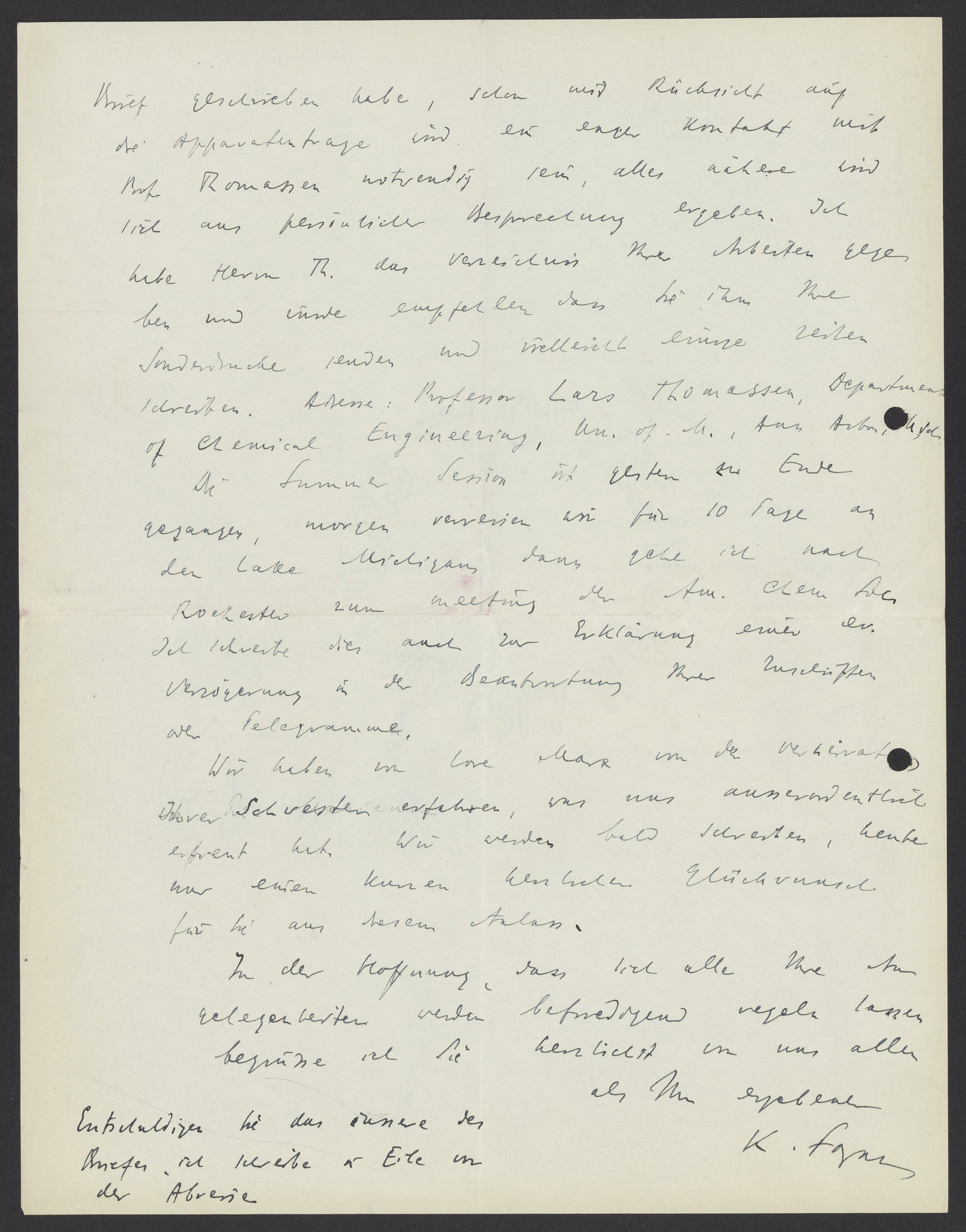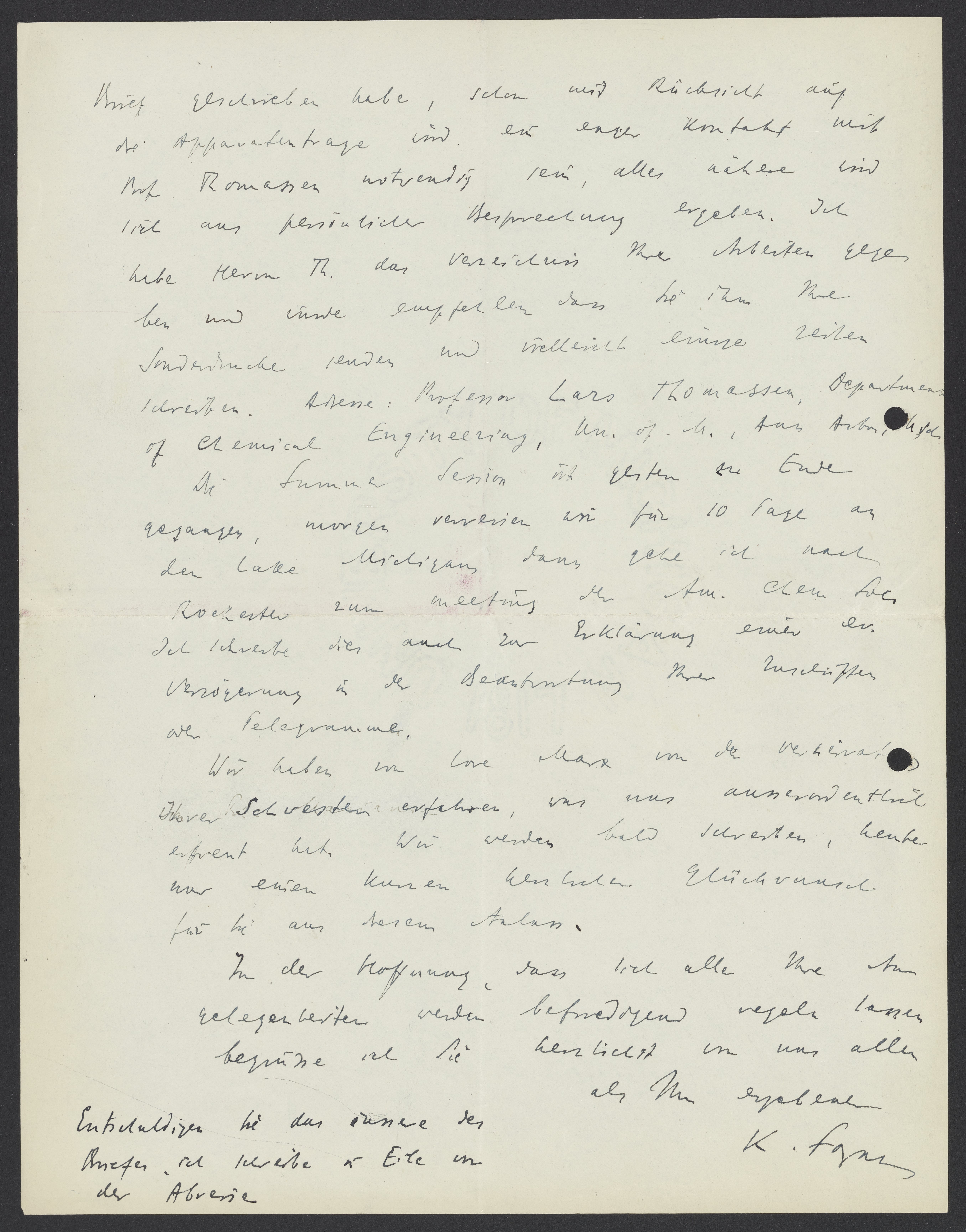 Brief geschrieben habe, schon mit Rücksicht auf Apparatenfrage und einen engen Kontakt mit Prof. Thomassen, alles näheres wird sich aus persönlicher Besprechung ergeben. Ich habe Herrn Th. das Verzeichnis Ihrer Arbeiten gegeben und würde empfehlen dass Sie ihm Ihre Sonderdrucke senden und vielleicht einige Zeilen schreiben. Adresse: Professor Lars Thomassen, Department of Chemical Engineering, University of Michigan, Ann Arbor, Michigan.