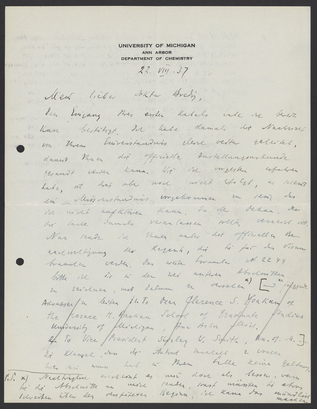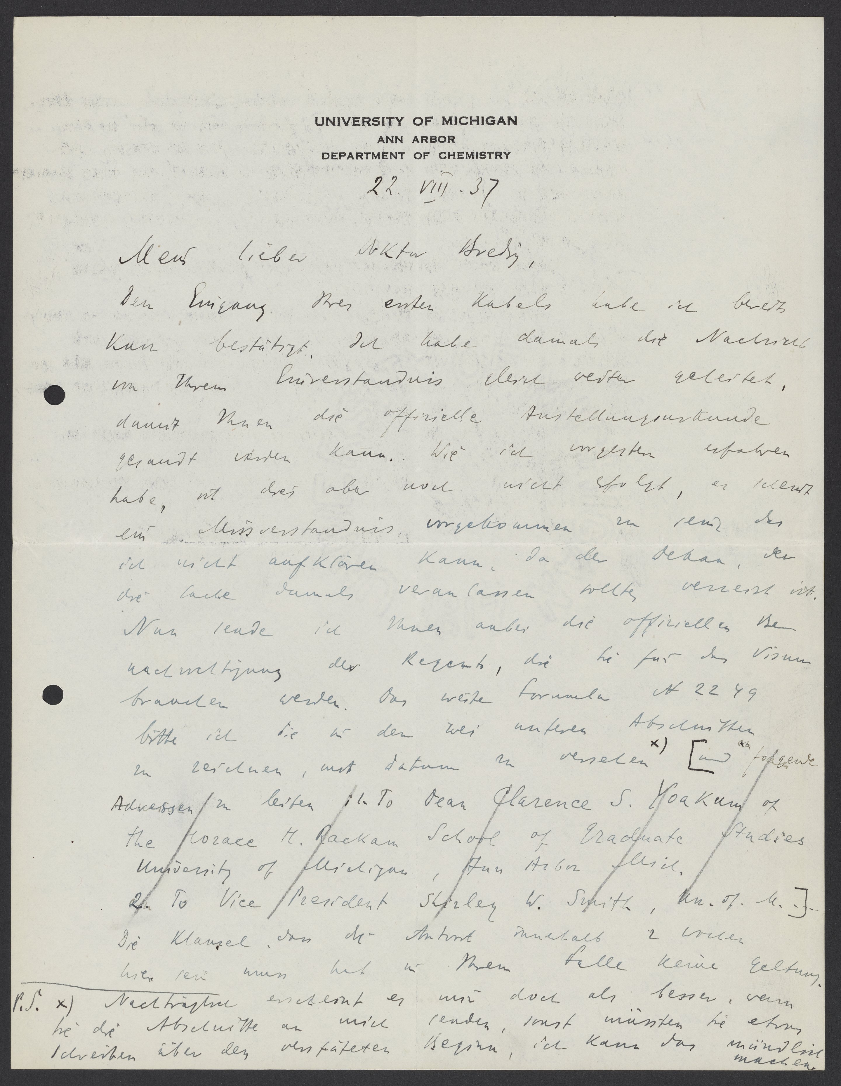den Eingang Ihres ersten Kabels habe ich bereits kurz bestätigt. Ich habe damals die Nachricht von Ihrem Einverständnis gleich weiter geleitet, damit Ihnen die offizielle Zustellungsurkunde gesandt werden kann. Wie ich erst gestern erfahren habe, ist dies noch nicht erfolgt, er scheint ein Missverständnis vorgekommen zu sein, das ich nicht aufklären kann, da der Dekan, der die Sache damals veranlassen sollte, verreist ist. Nun sende ich Ihnen anbei die offiziellen Bemächtigung der Regents, die Sie fuer das Visum brauchen werden. Das zweite Formula N2249 bitte ich Sie mit den zwei unteren Abschnitten zu zeichnen, mit Datum zu versehen* und folgende Adresse zu leiten: [ 1. To Dean Clarence Yoakum oft he Horace H. School of Graduate Studies, University of Michigan, Ann Arbor. 2. To Vice President Shirley W. Smith, Un. of Mich.] Die Klausel, dass die Antwort innerhalb zwei Wochen hier sein muss hat in Ihrem Falle keine Geltung.