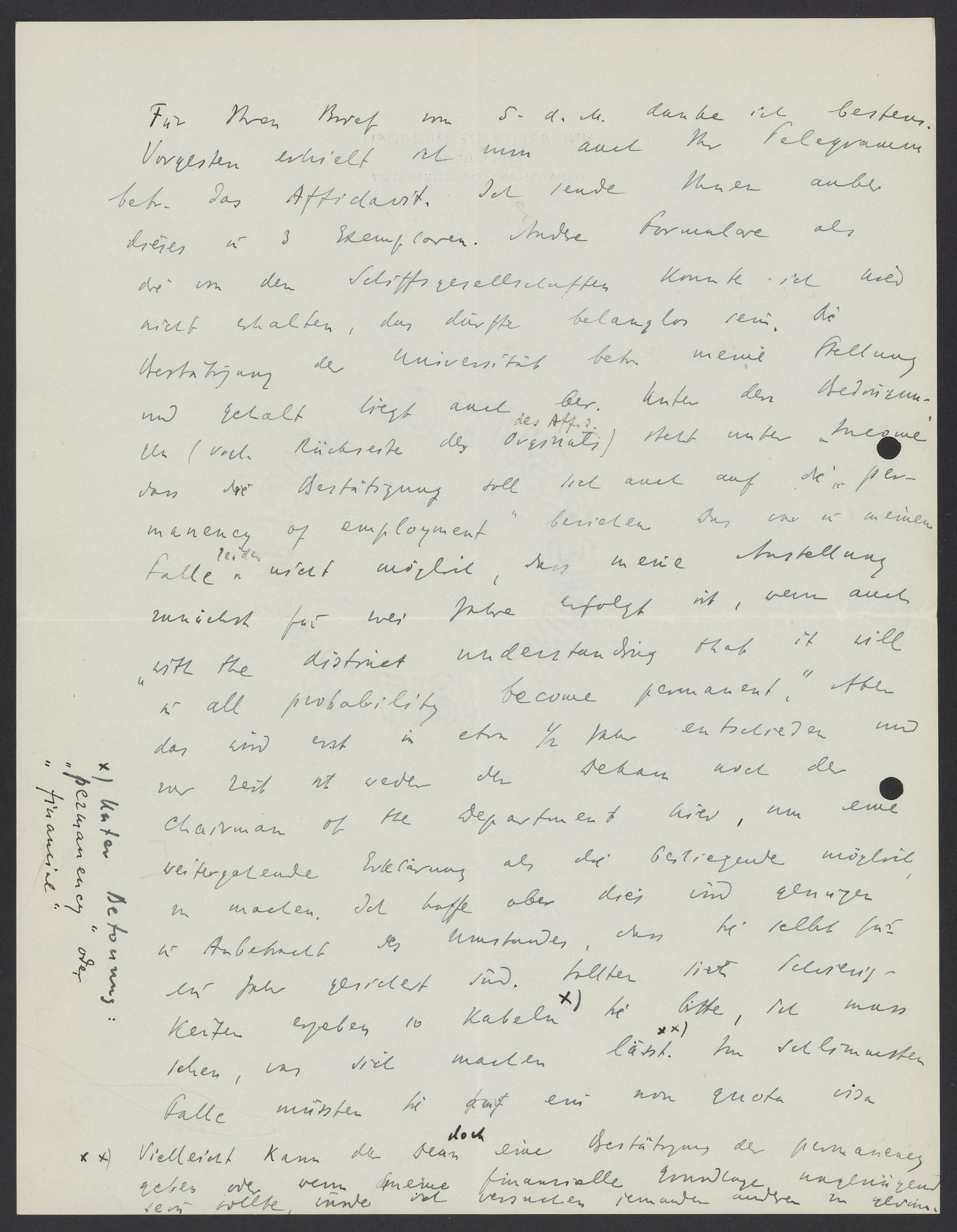 Für Ihren Brief vom 5. d.M. danke ich bestens. Vorgestern erhielt ich auch Ihr Telegramm bet. das Affidavit. Ich sende Ihnen auch dieses in 3 Exemplaren. Andere Formulare als die von den Stiftsgesellschaften konnte ich aber nicht erhalte, das dürfte belanglos sein. Die Bestätigung der Universität bet. meine Stellung u. Gehalt liegt auch bei. Unter den Bestimmungen (vergl. Rückseite des Originals) steht unter „Income“, dass die Bestätigung soll sich auf die „permanency of employment“ beziehen. Das ist leider in meinem Falle nicht möglich, da meine Anstellung zunächst für zwei Jahre erfolgt ist, wenn auch „with the distinct understanding that it will in all probability become permanent.“ Aber das wird erst in etwas ½ Jahr entschieden und zur Zeit ist weder der Dekan noch der Chairman of the Department hier, um eine weitergehende Erklärung als die beiliegende möglich zu machen. Ich hoffe aber dies im genauen Anbetracht des Umstandes, dass Sie selbst fuer ein Jahr gesichert sind. Sollten sich Schwierigkeiten erfolgen kabeln* Sie bitte, ich muss sehen, was sich machen lässt.** Im schlimmsten Falle müssten Sie auf ein non quota Visa