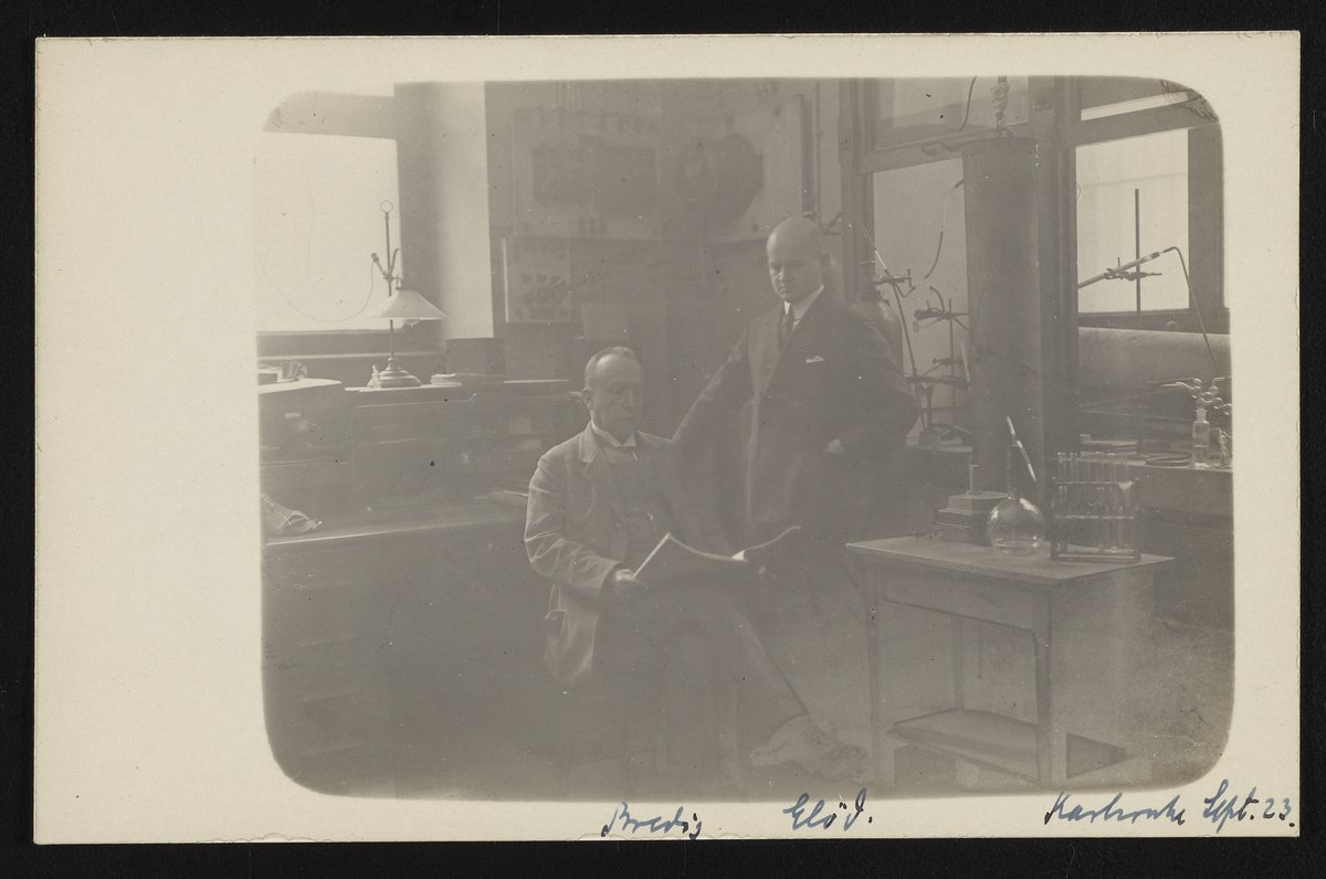 Small JPG1200 x 796px — 100 KBLarge JPG2880 x 1910px — 536 KBFull-sized JPG3431 x 2275px — 739 KBOriginal fileTIFF — 3431 x 2275px — 22.4 MBBlack and white photograph of Georg Bredig (1868-1944) seated and reading a book and Egon Elöd (1891-1960) standing and peering over his shoulder at the Technical University in Karlsruhe. To their right are glassware and apparatuses. At the time this photograph was taken, Elöd was a private lecturer, teaching textile and tanning chemistry. In 1926, he became a full-time professor.